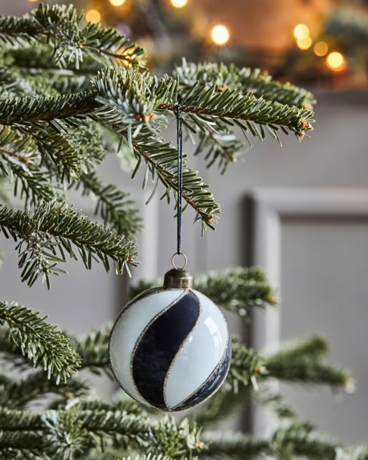 Elevate your festive décor with this striking COIL BLACK & WHITE GLASS BAUBLE. Featuring an eye-catching geometric coil design in classic black and white, this ornament brings contemporary elegance to your Christmas tree. Crafted from quality glass, it catches the light beautifully, creating a sophisticated shimmer among traditional decorations. Perfect for adding modern flair to your holiday display whilst maintaining timeless charm. A stunning statement piece that complements any colour scheme.