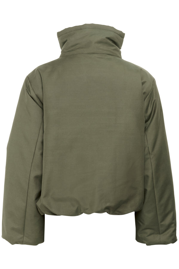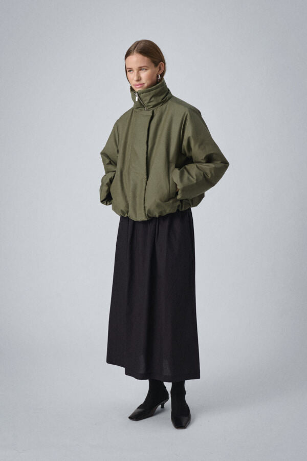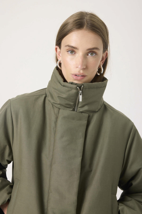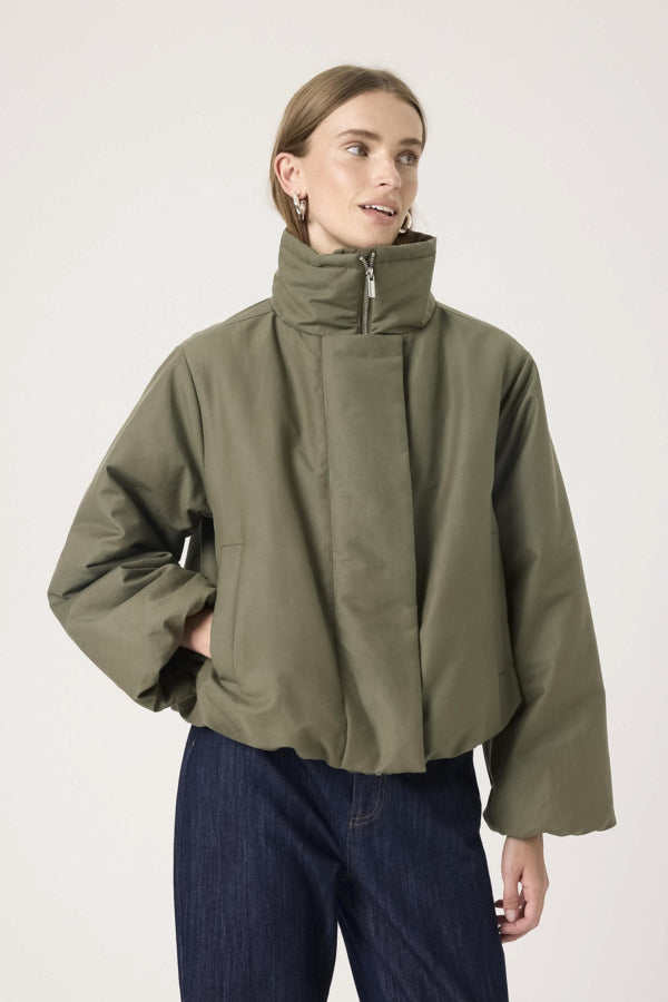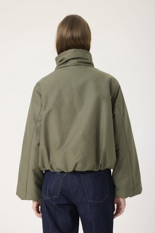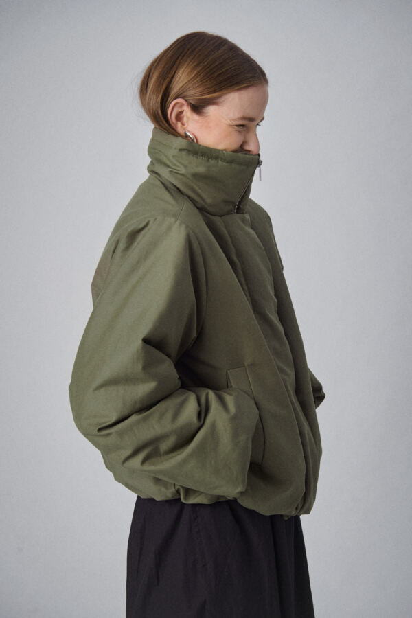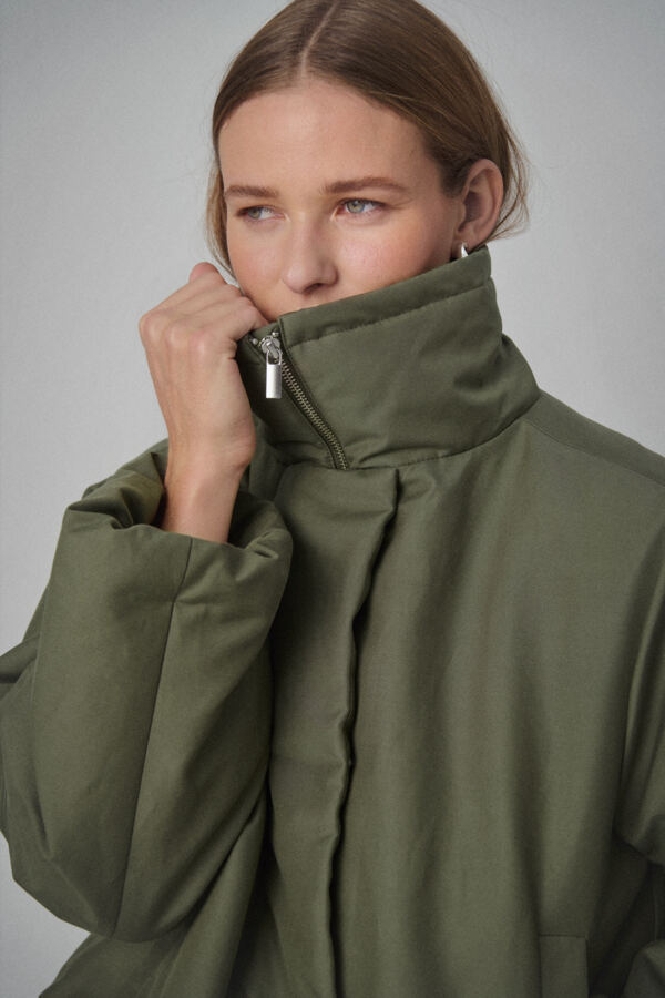 Warm army green jacket with a high collar and hidden zip. The cropped, boxy fit adds a modern edge, while the quilted lining ensures all-day comfort.