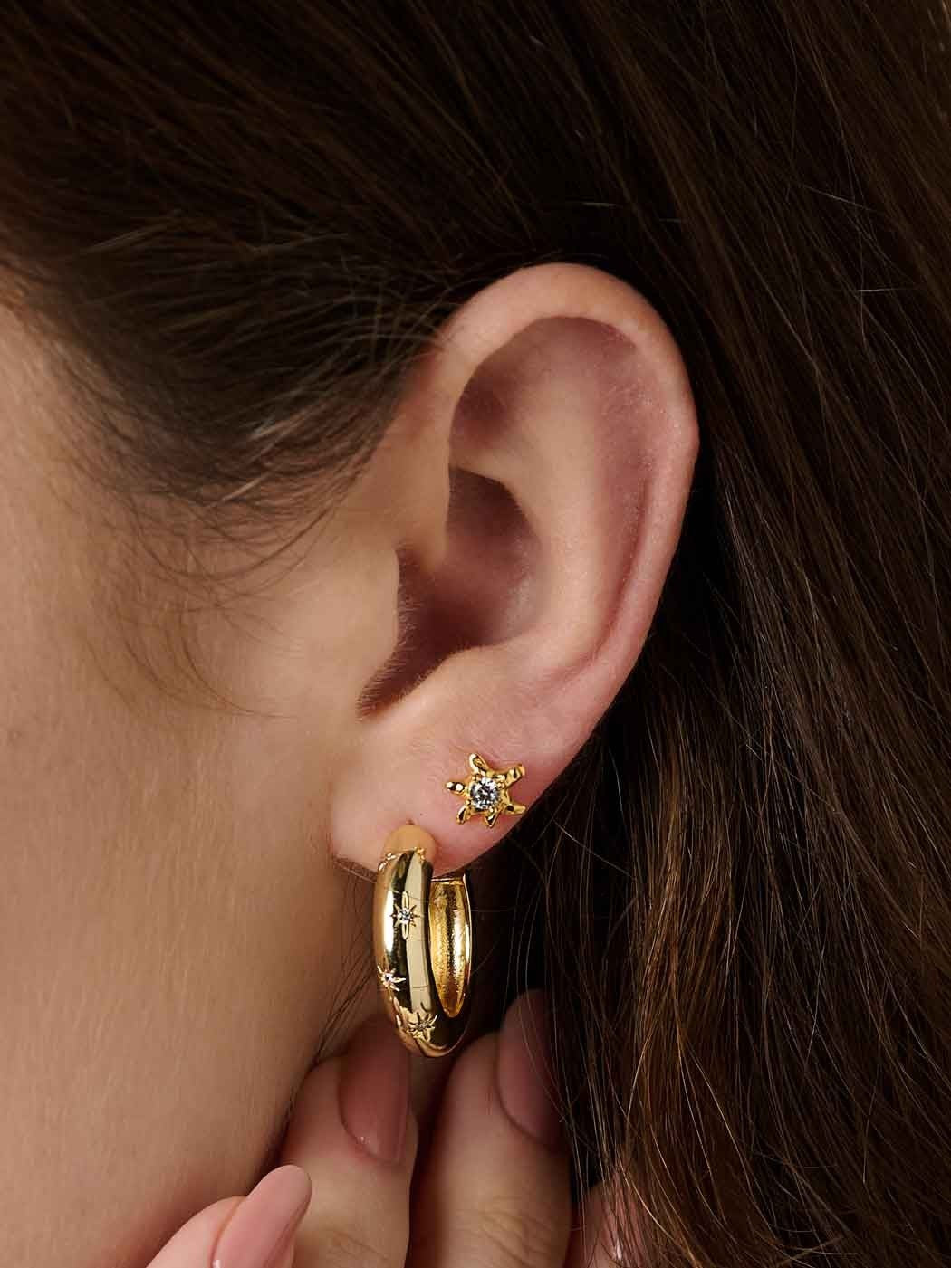 Catch the light with these hand carved star studs, featuring a shimmering cubic zirconia at the center. Stacking your shine never looked this good.
