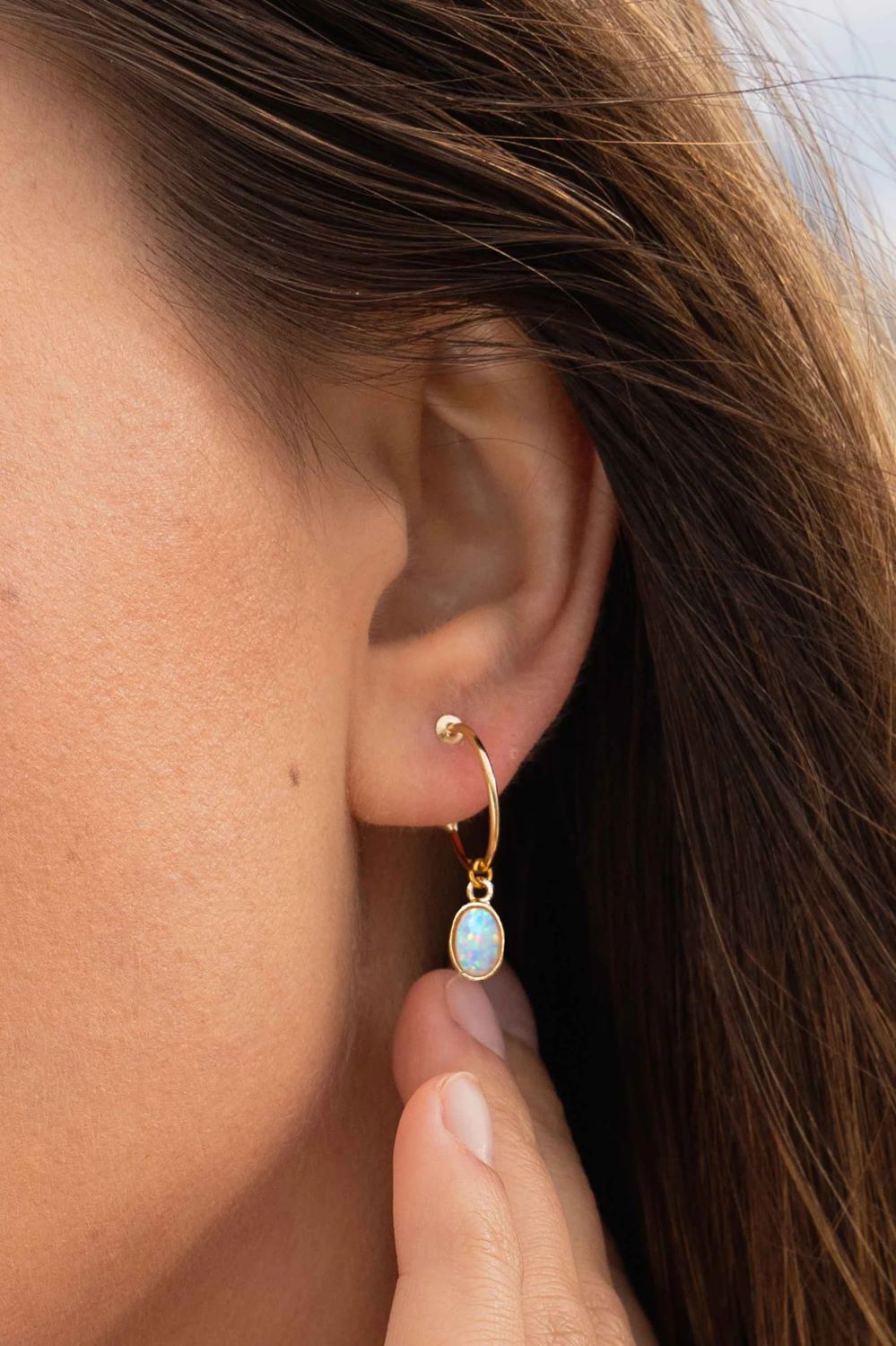 Give your ear stack a distinctive finish with these delicate oval charms sat snugly in a gold bezel. Hung on open ended slim hoops, these earrings pair perfectly with studs or other hoops for a layered look.
