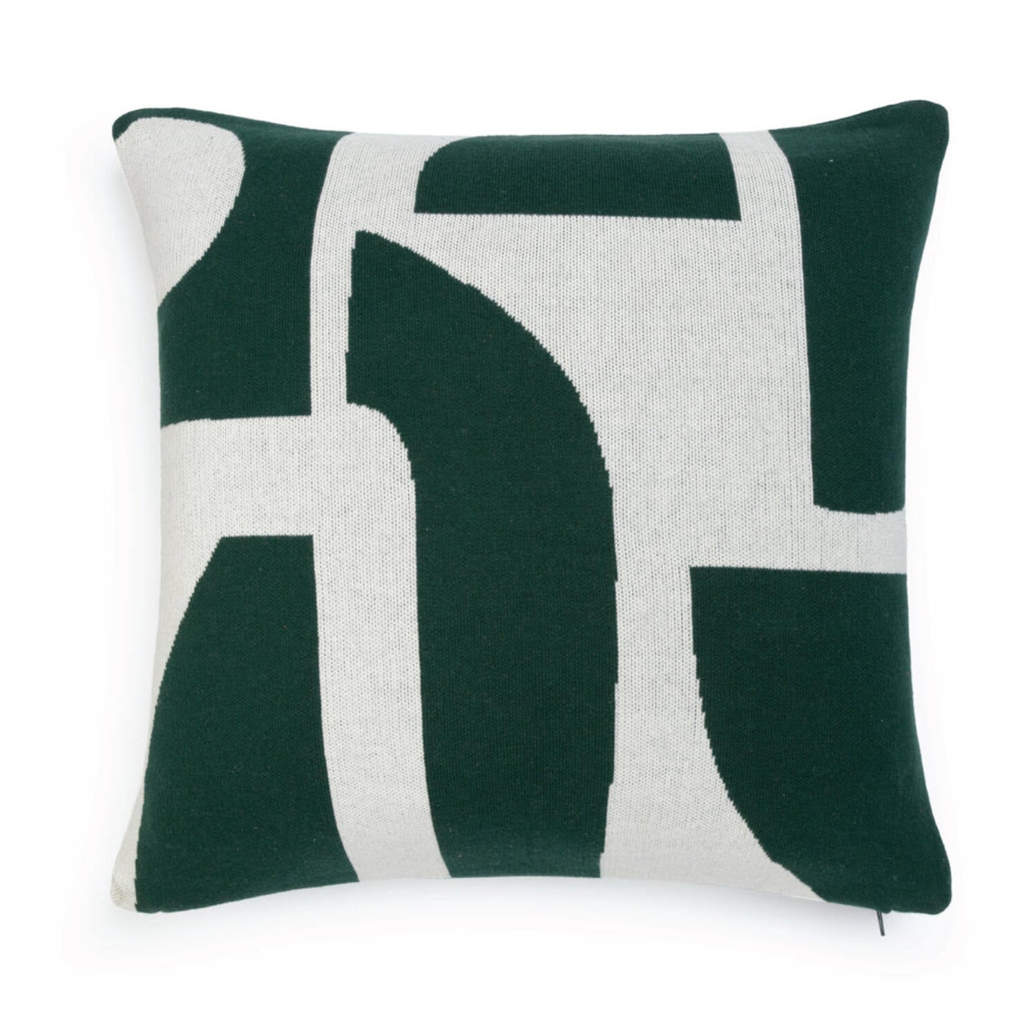 A reversible cotton knit cushion featuring a striking all over design in forest green and ivory. This cushion looks great next to Enkel Forest, and we love to see Forest paired with black and ivory cushions and throws too.
