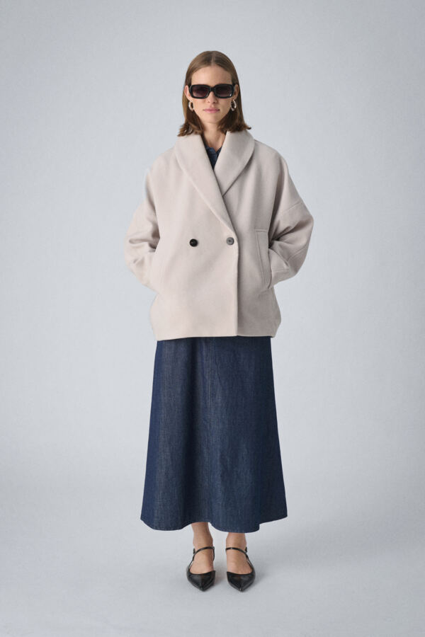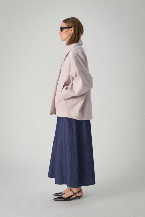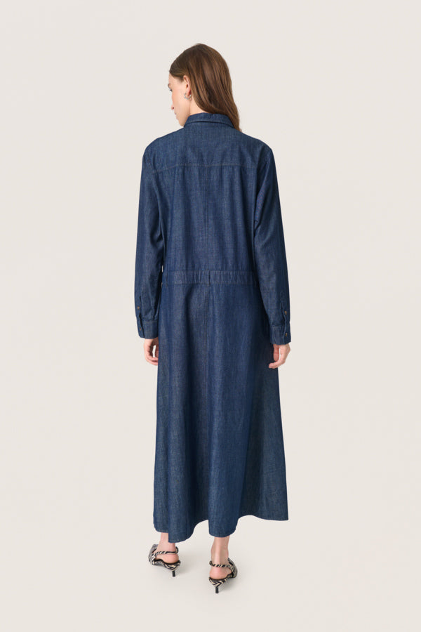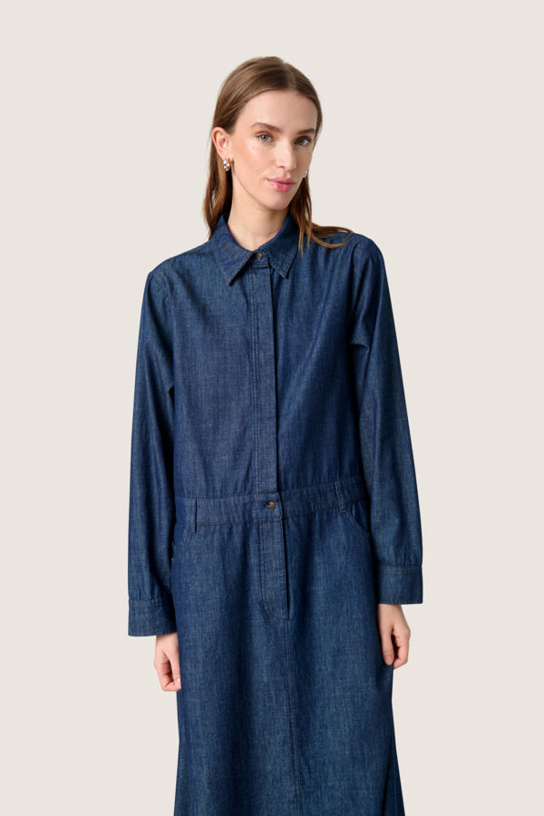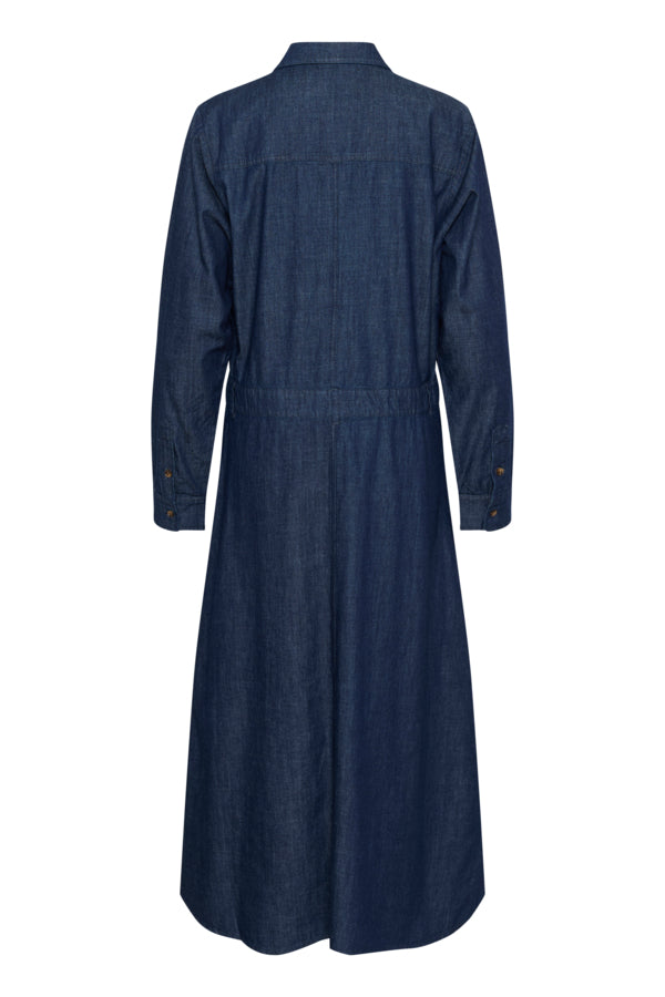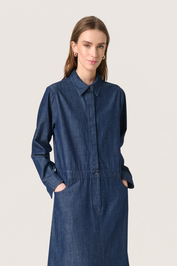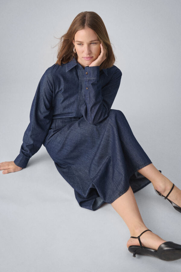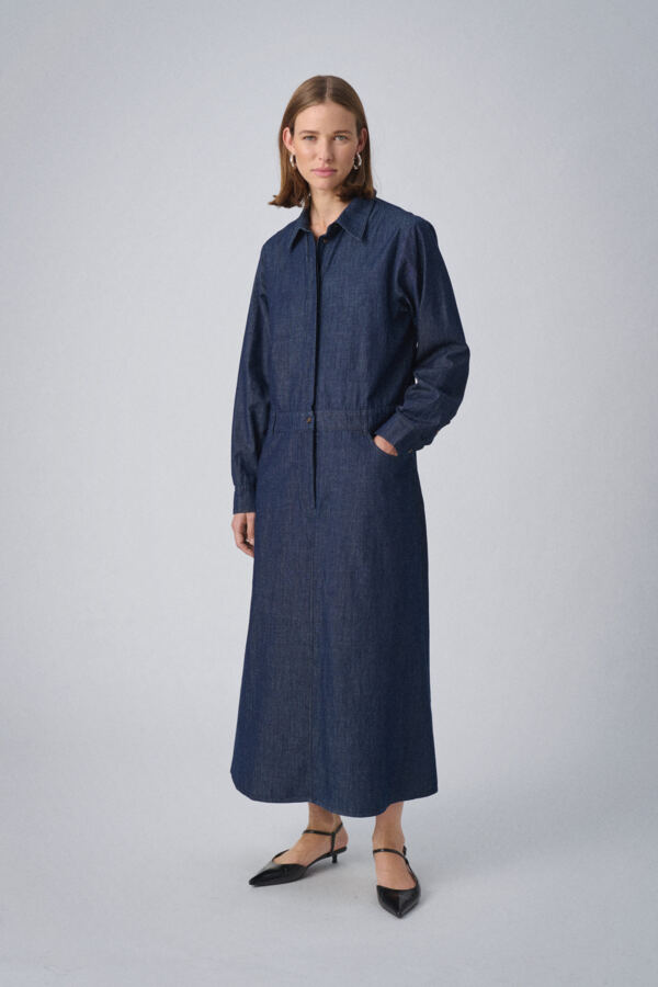 Elegant denim dress in a deep blue wash with long sleeves and a concealed button placket. Designed with a flattering loose fit and practical side pockets. Ideal for everyday wear and office styling.