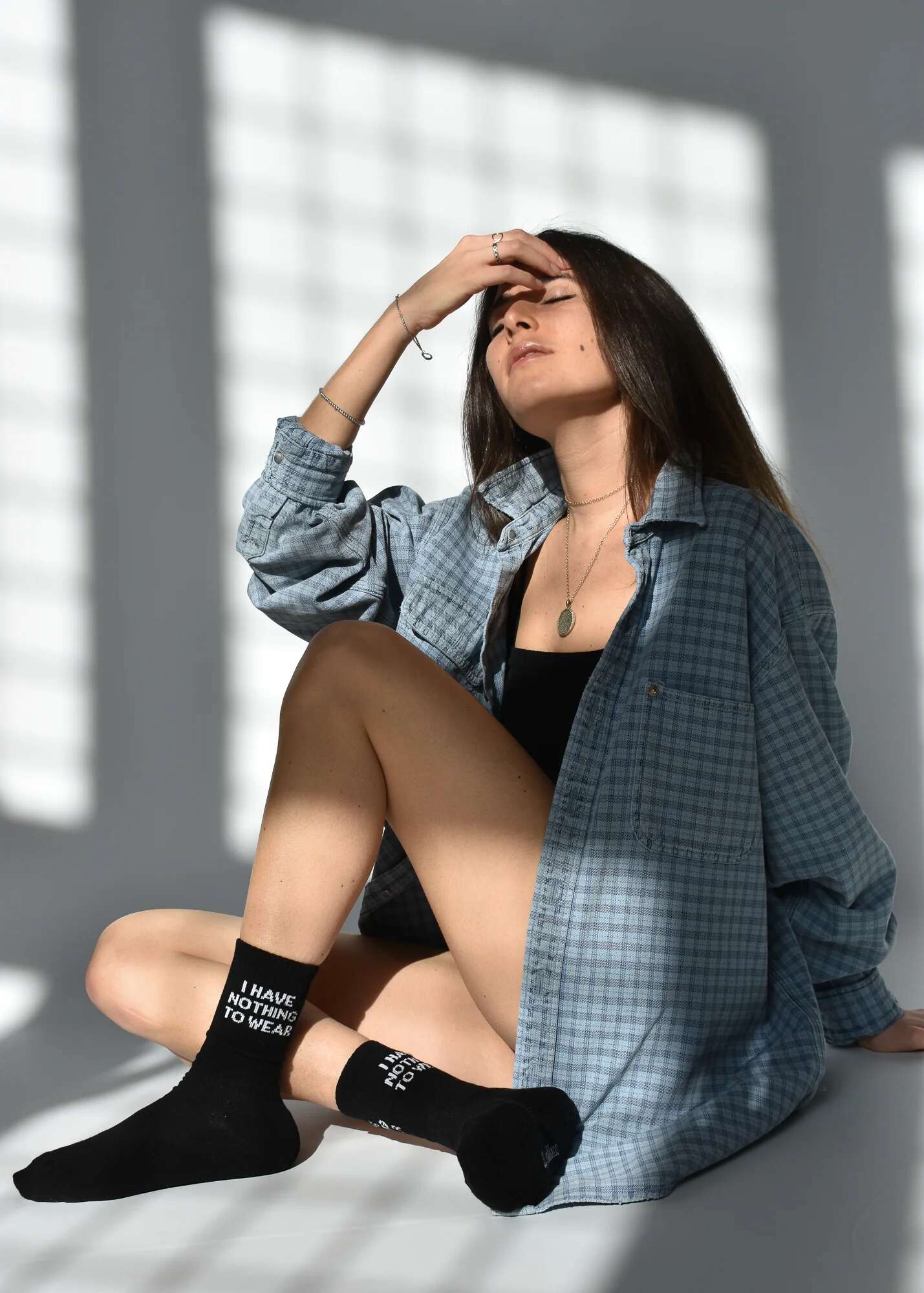 Your ultimate crew length sock, with I HAVE NOTHING TO WEAR slogan detail. With arch support and a cushioned heel and toe, Soxygen socks take comfort to another level. Elasticated stretch. One size fits all.