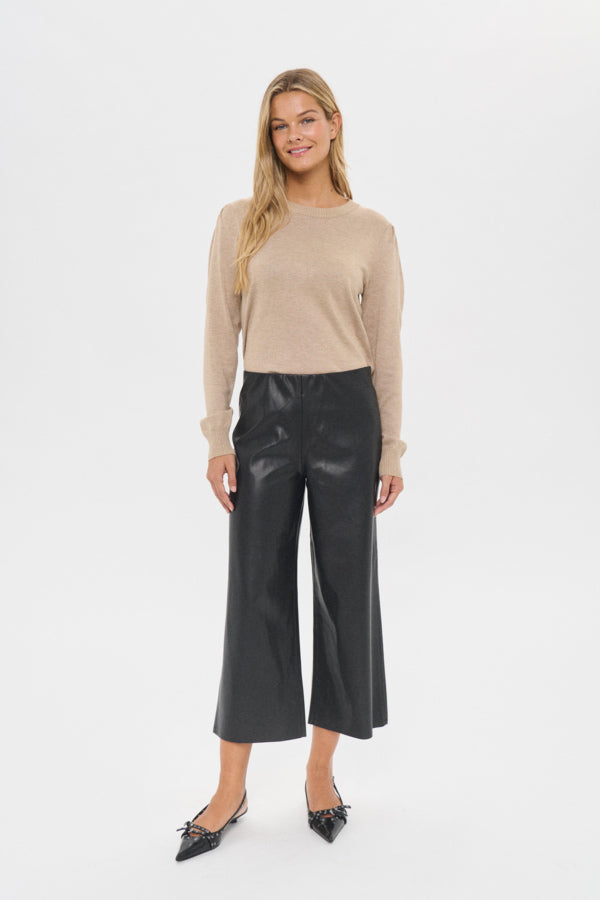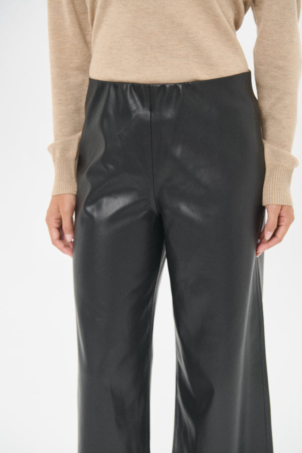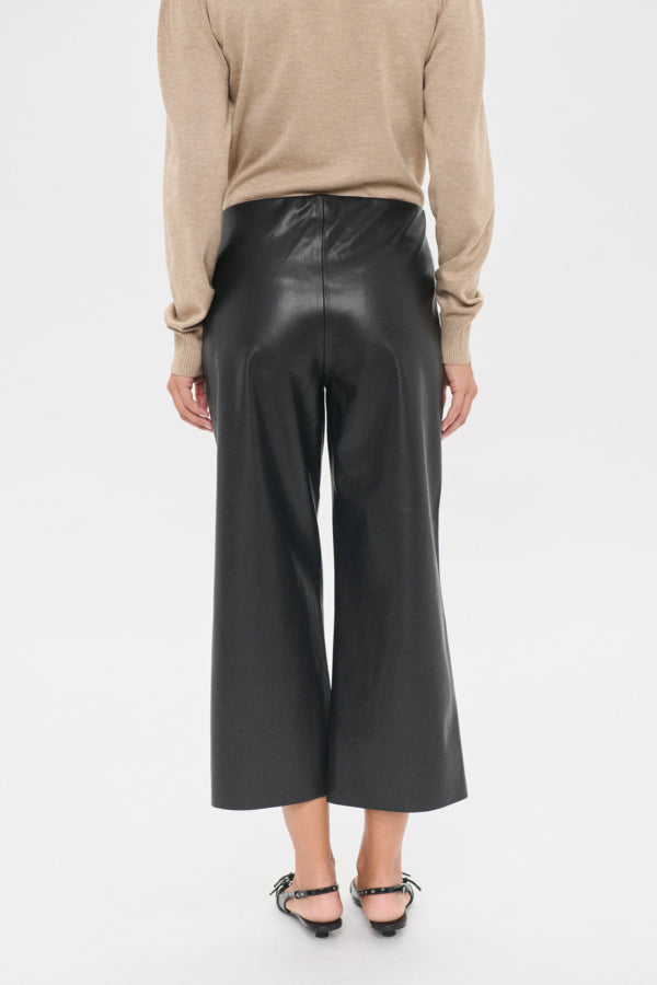 These cropped leather-look pants combine sleek style with effortless edge. Their tailored fit and ankle-length cut make them perfect for modern, minimal outfits, while the smooth texture adds a refined touch. Ideal for versatile layering, they bring a subtle yet confident statement to your wardrobe.