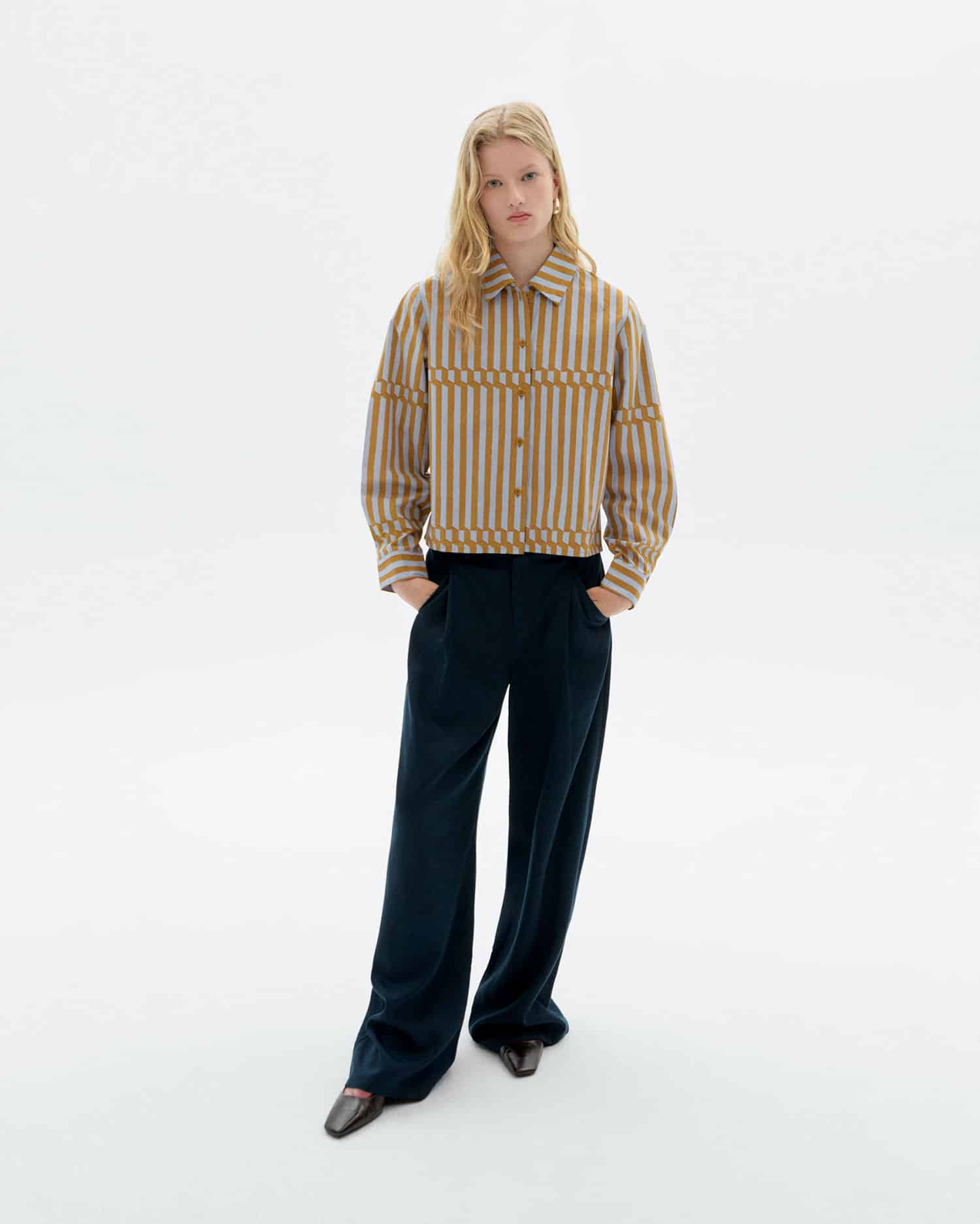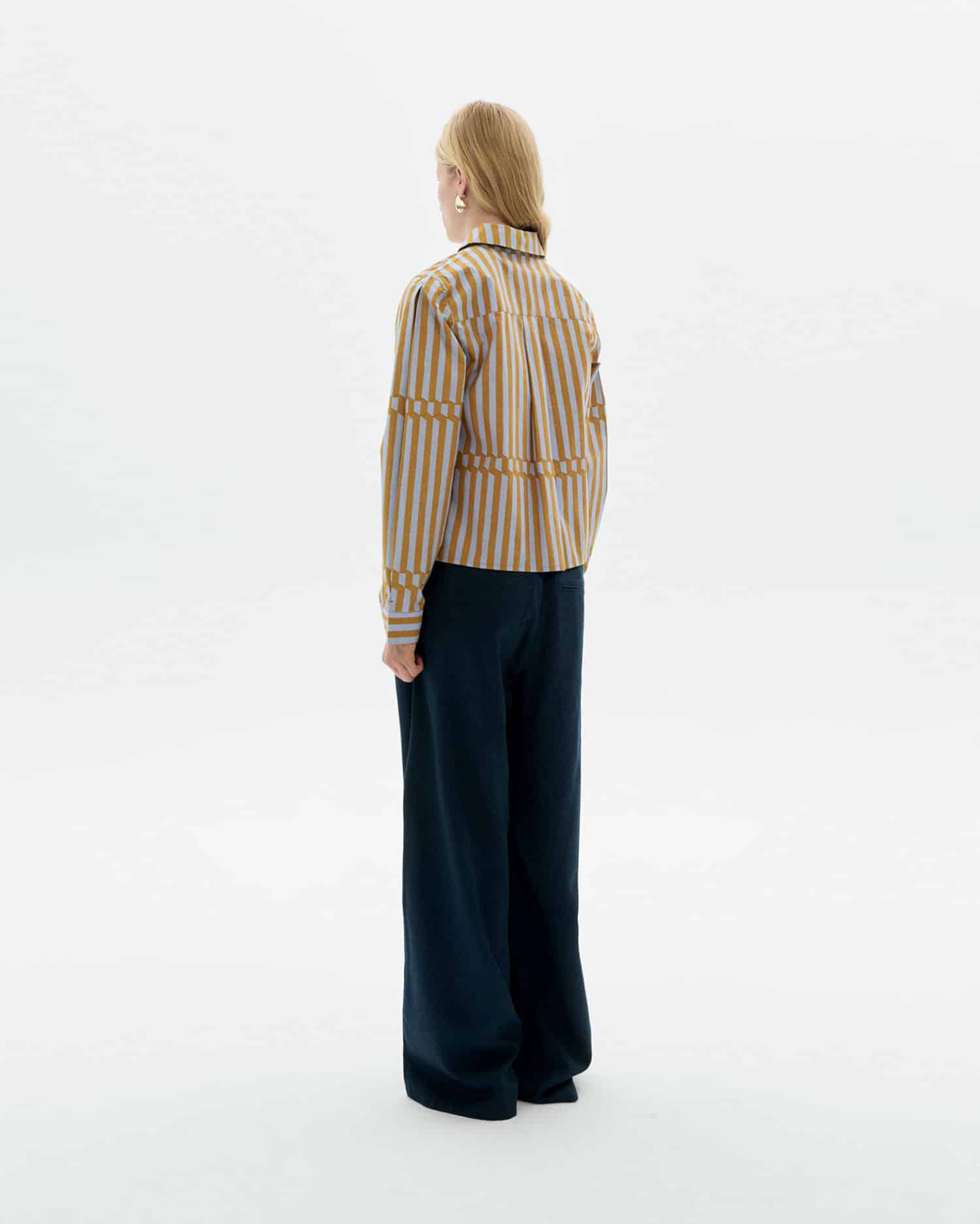 Striped poplin Esqué Duna blouse made from organic cotton, designed in collaboration with artist and designer Júlia Esqué, who has created different prints inspired by basketry and craftsmanship, using colored paper.
