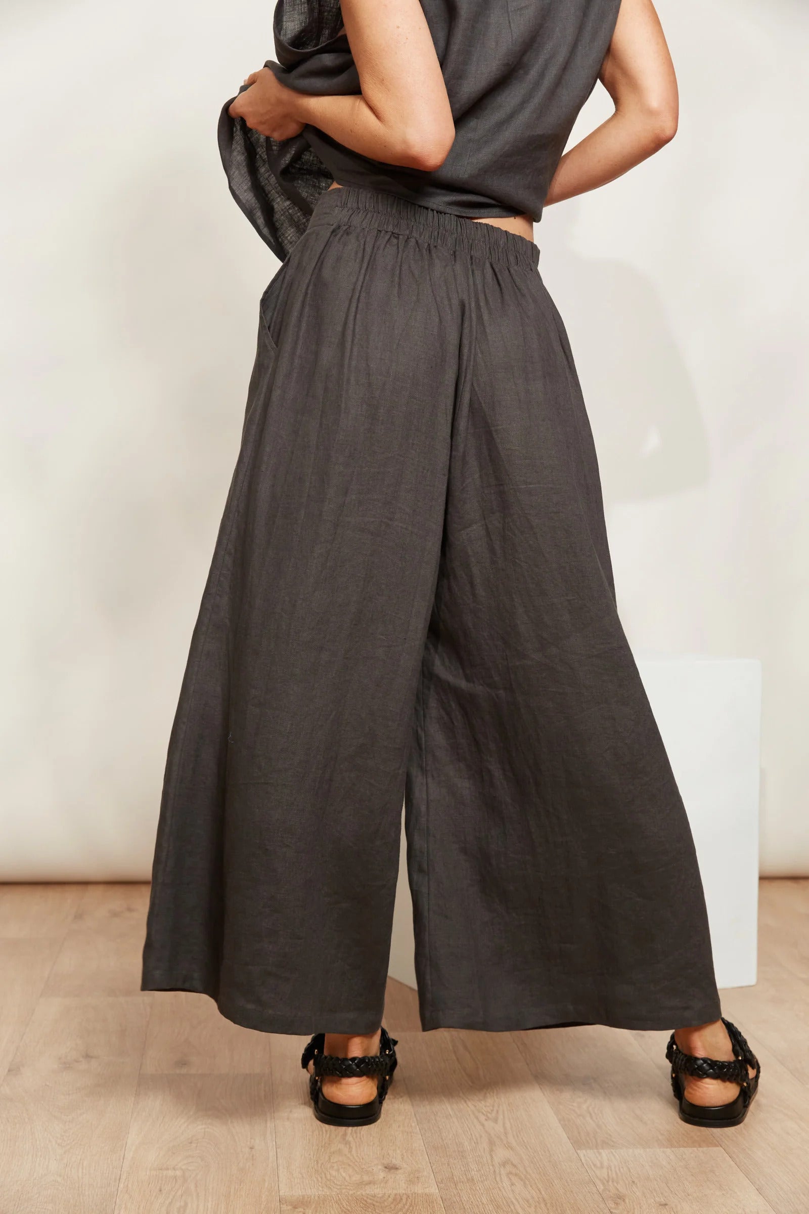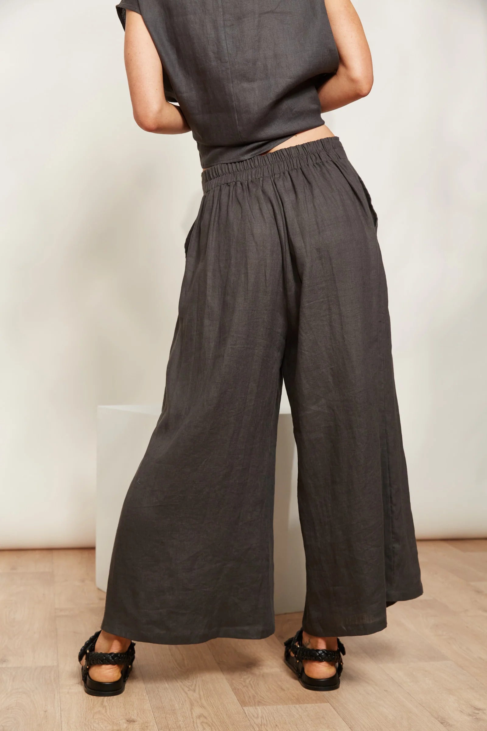 Boasting a sophisticated flat front, a half-elastic waist for that perfect fit, and a trendy wide-leg cut, the Halcyon Crop Pant is destined to be your new favourite. Crafted from sumptuous linen, they exude elegance and comfort in equal measure, giving you a sleek and contemporary silhouette. Pair them with your favourite slides or sneakers for an effortlessly chic off-duty ensemble.