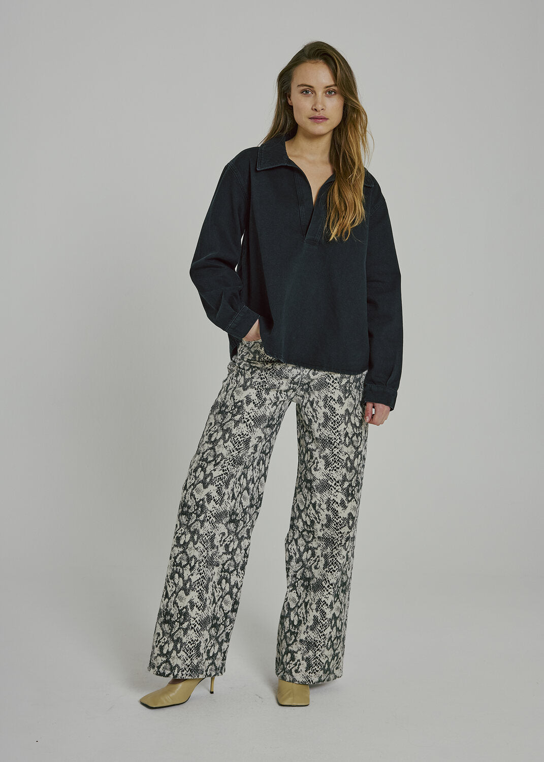 The Hannali v-neck denim top offers a relaxed, elevated take on a wardrobe essential. Designed with a deep V-neckline, a structured collar, and a loose, comfortable fit, it pairs effortlessly with both statement trousers and casual denim.
