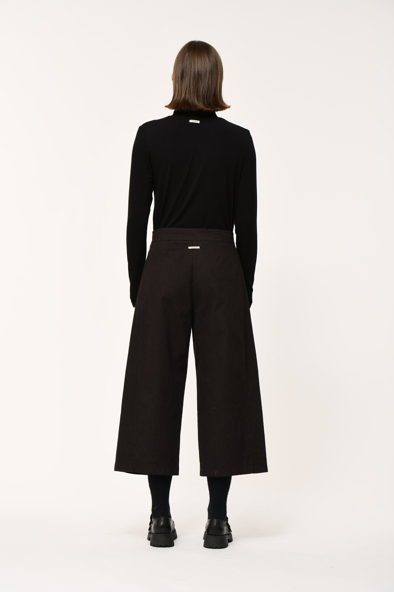 Wide-leg pants with flea-foot pattern, slightly rounded cut, yoke on the leg, high waist, fitted belt with belt loops, button and fly closure, invisible pockets in the front seams.