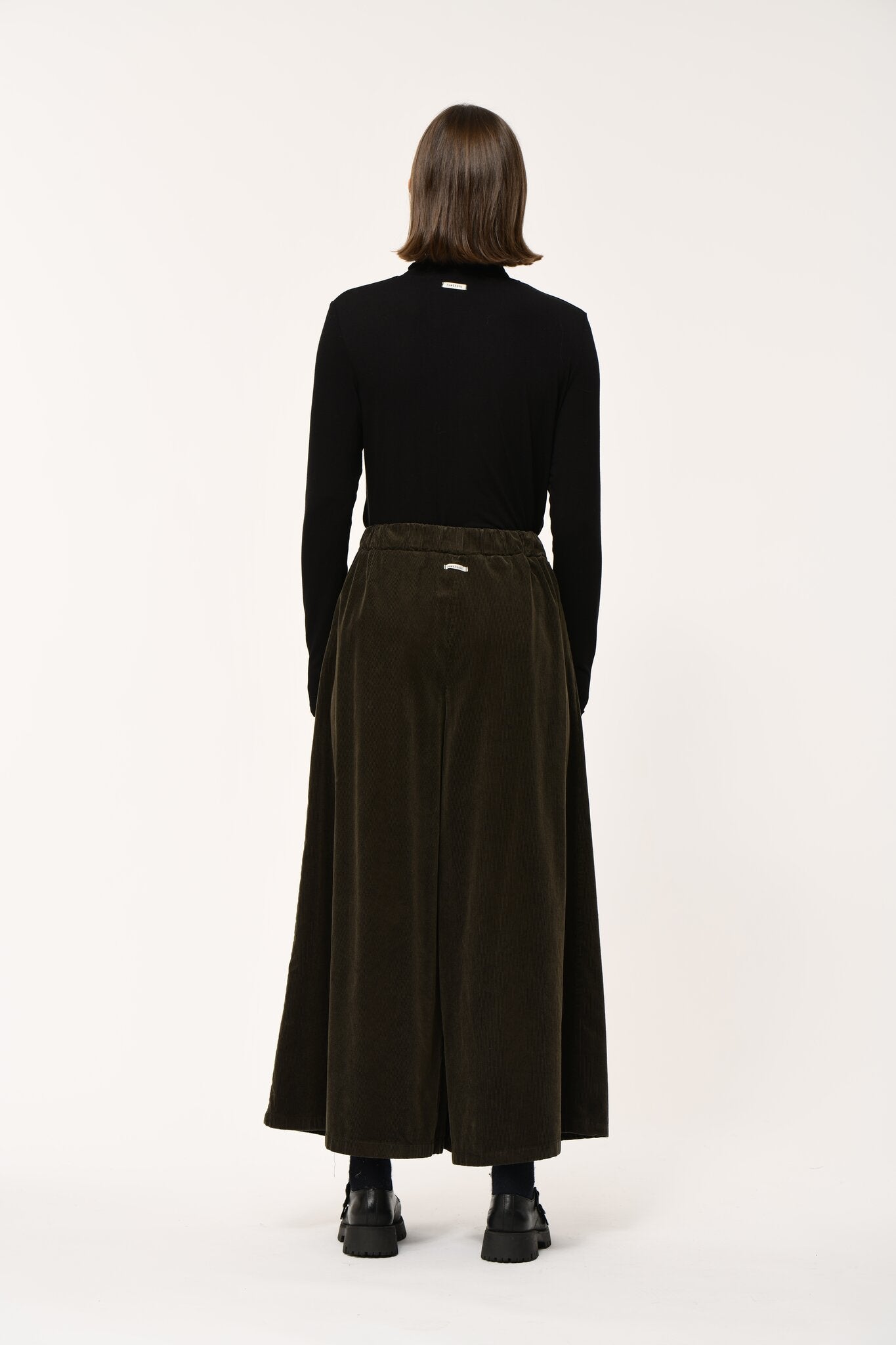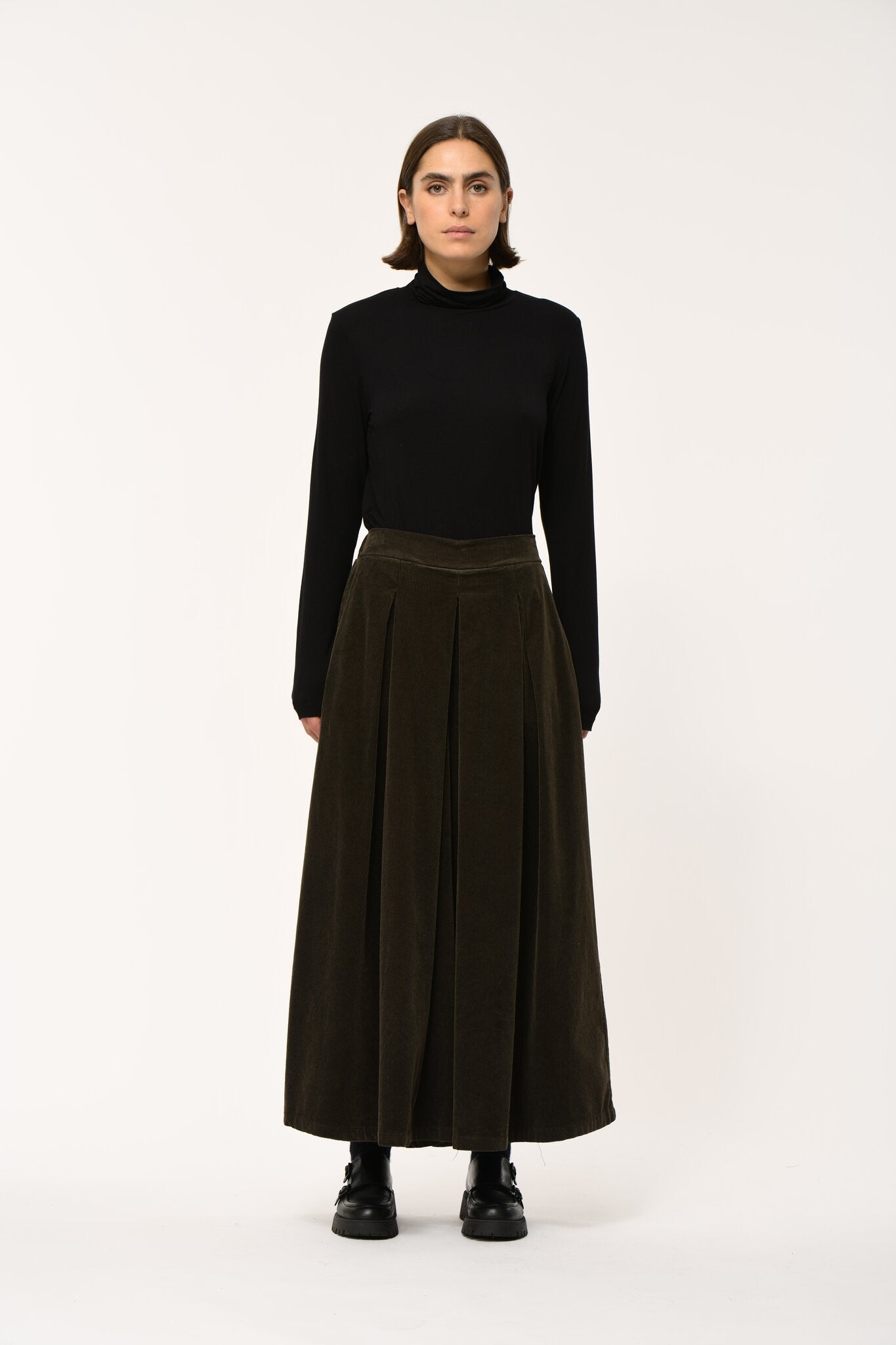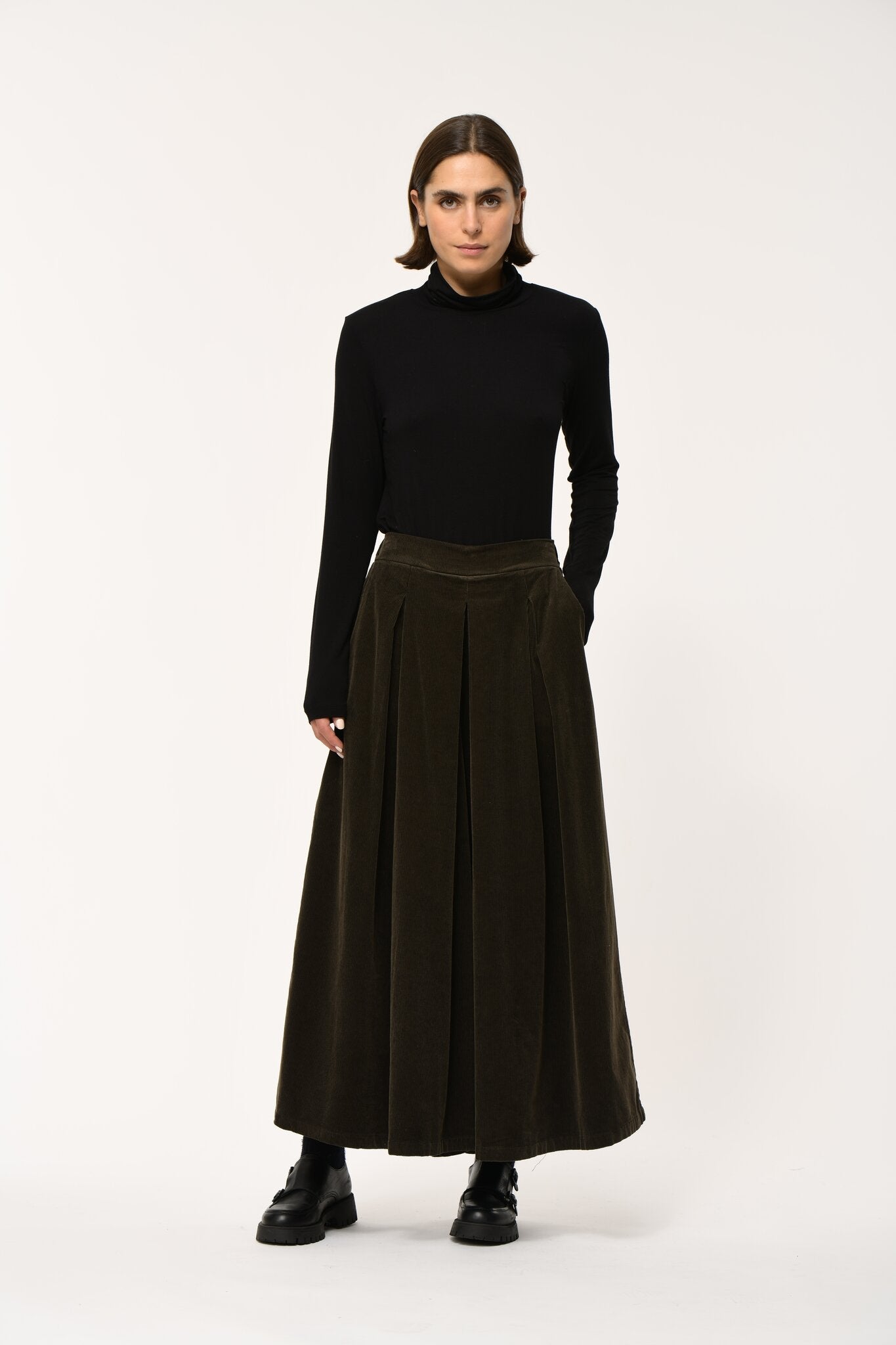 Wide-leg corduroy culottes, 7/8ths length, high waist, darts and box pleats, elasticated back waistband, Italian pockets.