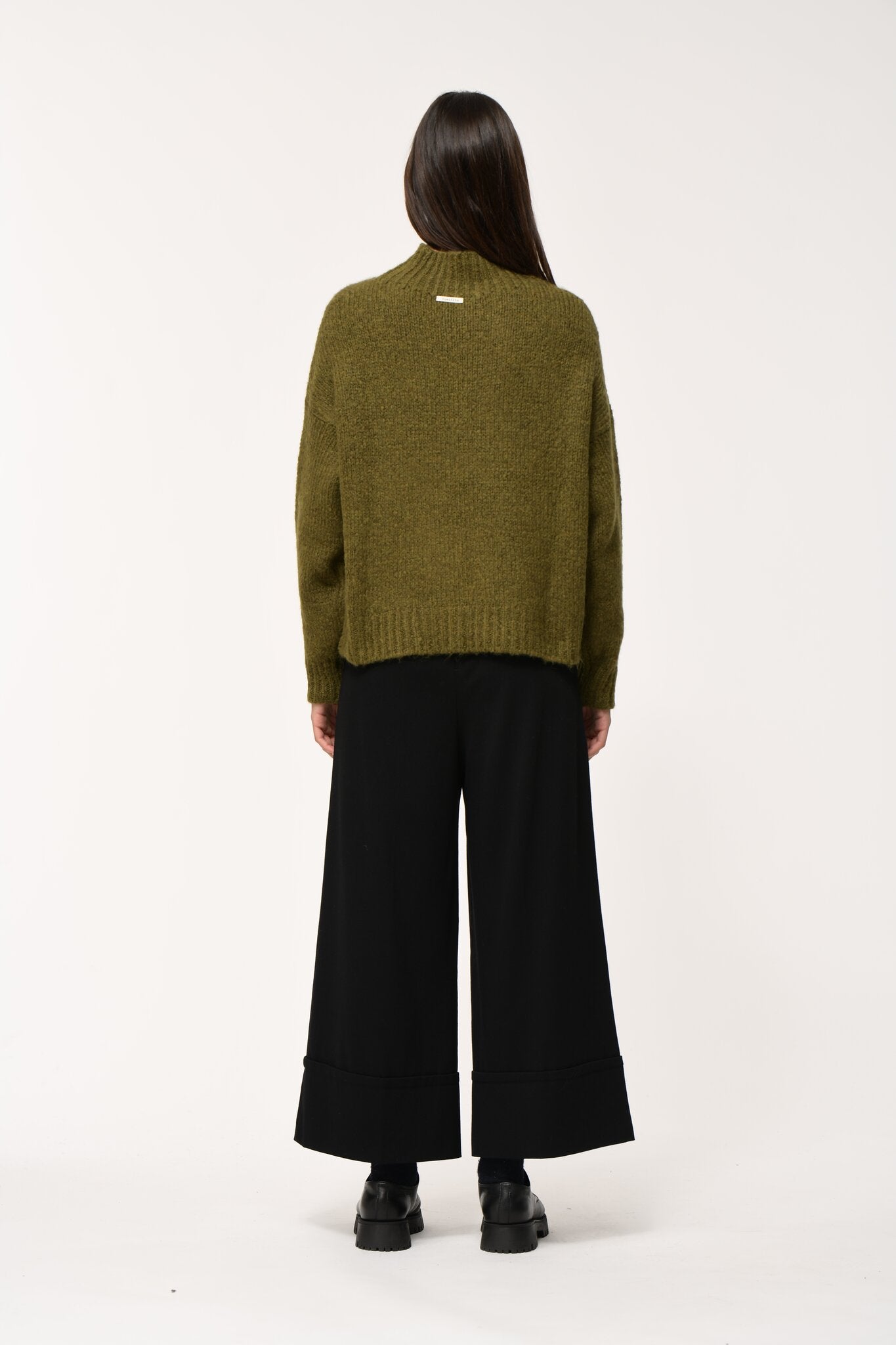 Oversized sweater in boucle knit, stand-up collar, dropped armholes, long sleeves, left patch pocket, ribbed trim.
