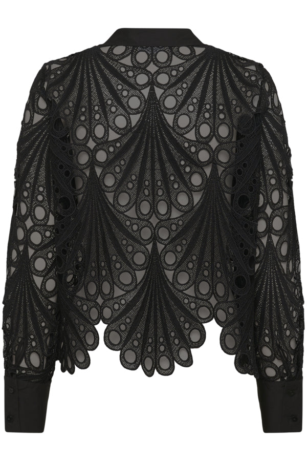 Black long-sleeved blouse in a decorative lace fabric with circular and fan-like embroidery. Features a scalloped hemline and cuffs with solid button placket and collar. Designed in a relaxed fit with semi-sheer sections.