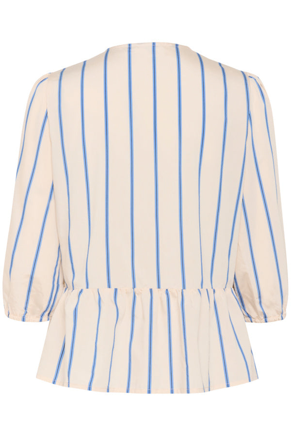 Beige blouse with a woven texture and vertical blue stripes. Round neckline with tie detail, decorative front buttons, and drawstring waist. 3/4-length sleeves with elastic and frilled hem. Light and relaxed silhouette.