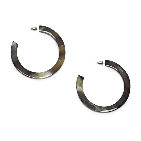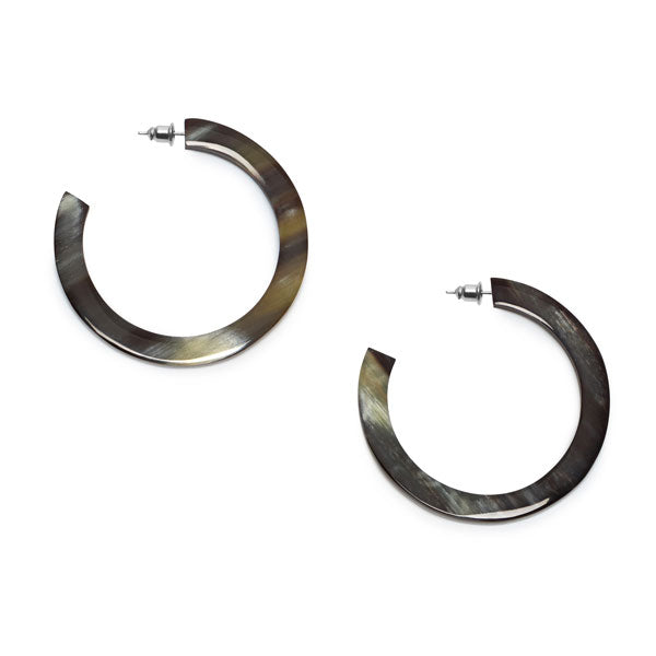 These striking black horn earrings are made entirely from a natural material, therefore colourings and patterns will vary from piece to piece, making each pair unique. This adds to the beauty of these beautiful earrings, as no two pairs are ever quite the same.