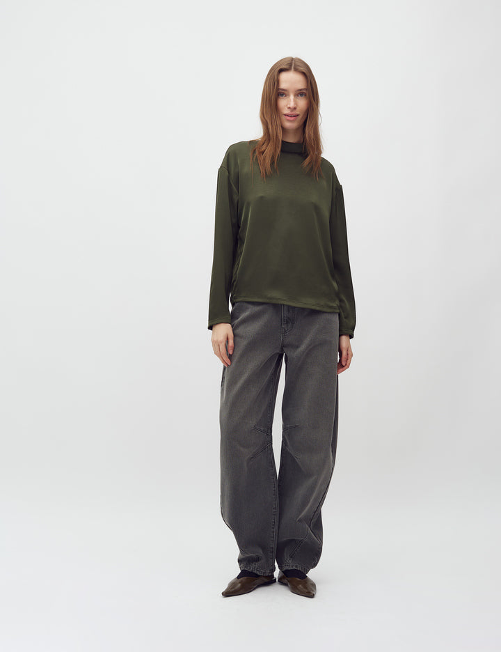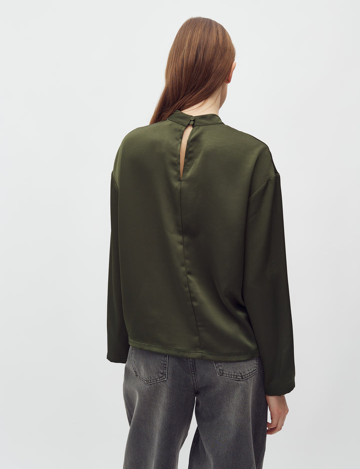 Understated sophistication in pine green. The LINEA short blouse pairs a relaxed long-sleeve cut with refined proportions, embodying Scandinavian design principles. Versatile enough to layer under knitwear or wear solo, this piece anchors a capsule wardrobe with its muted, flattering tone and timeless appeal.