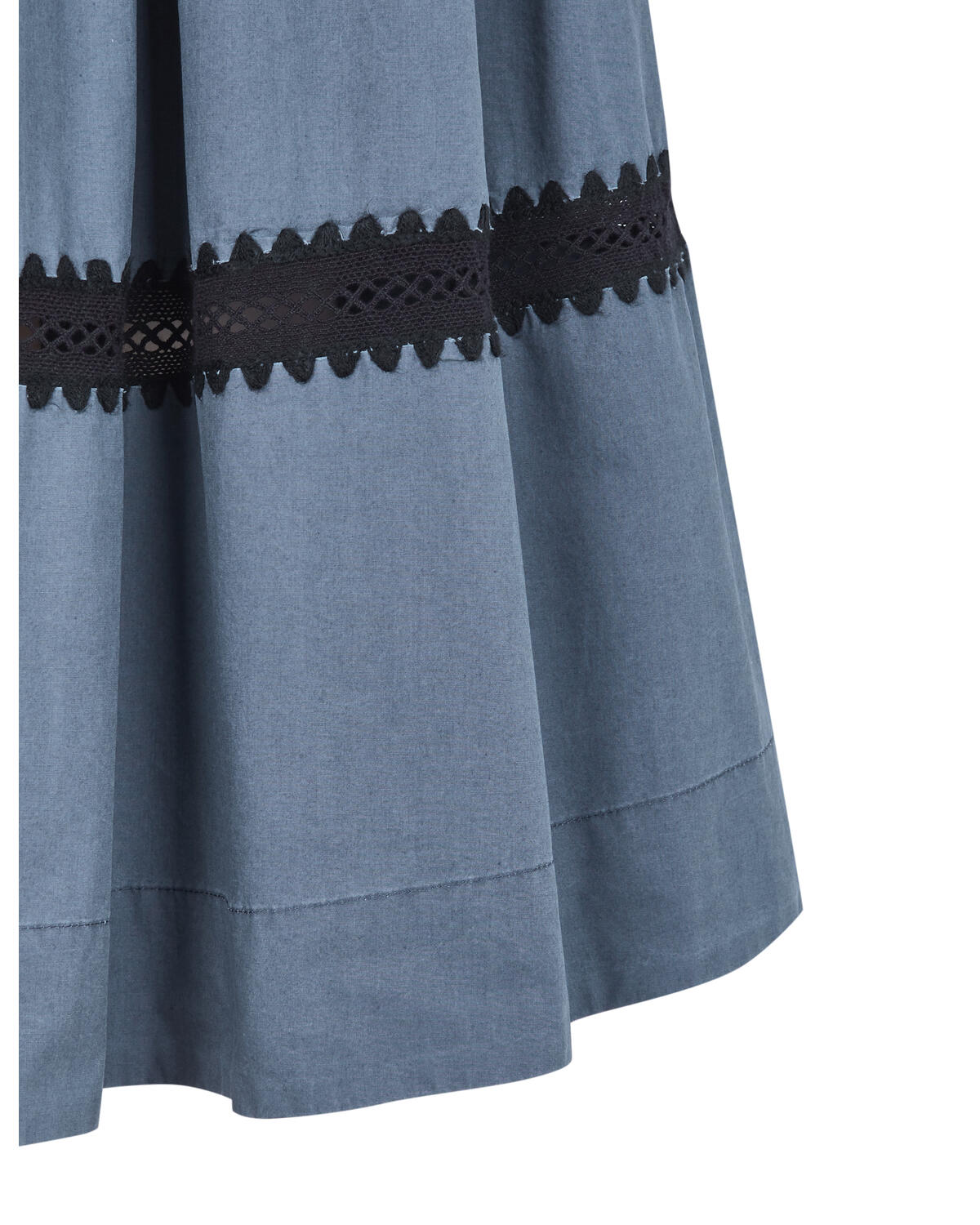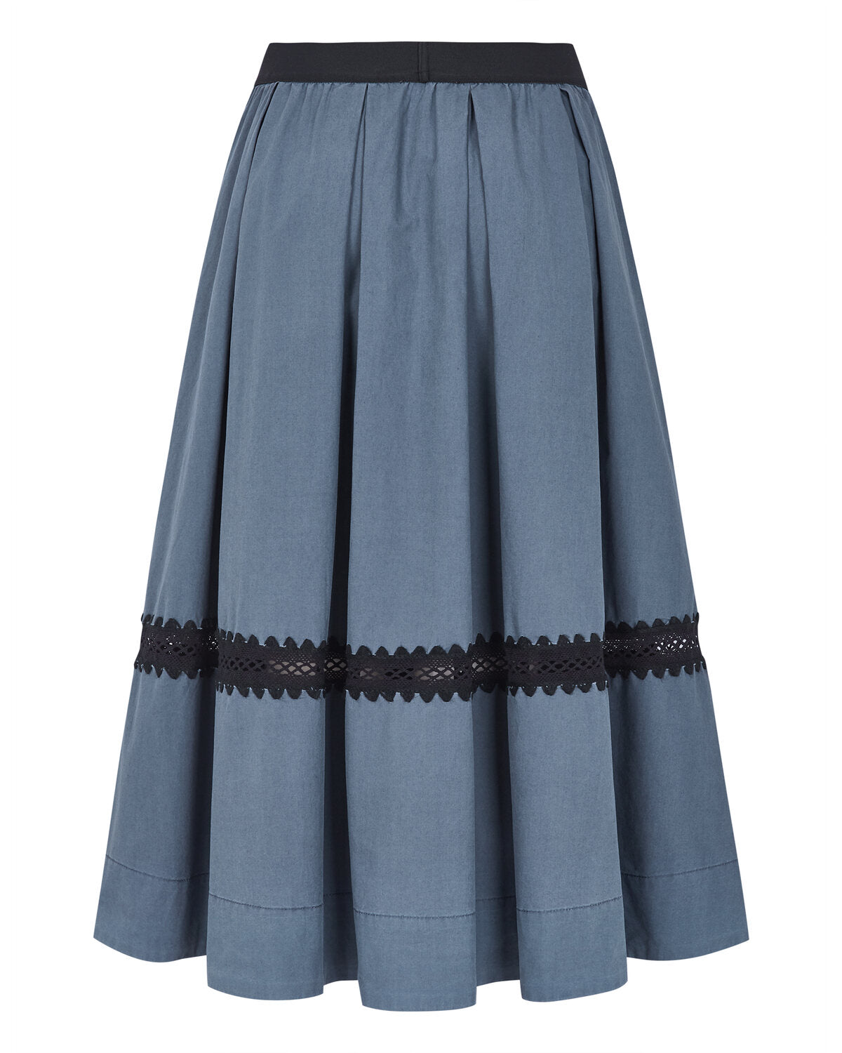 The MALULA SKIRT BLUE NIGHTS features a clean, elegant silhouette with delicate black lace detailing that adds a subtle touch of sophistication. Its streamlined design and refined accents make it a versatile piece for effortless styling throughout the seasons.