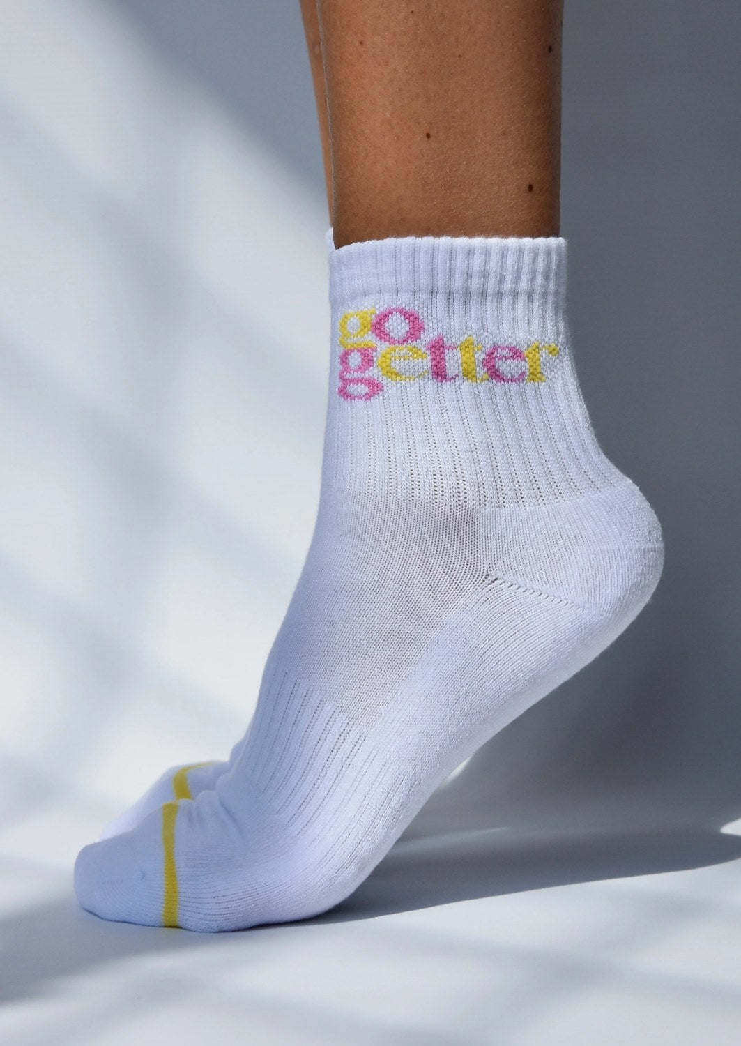 Summer bright ribbed crew socks, with GO GETTER slogan detail, hit just above the ankle. With arch support and a cushioned heel and toe, Soxygen socks take comfort to another level. Elasticated stretch. One size fits all.