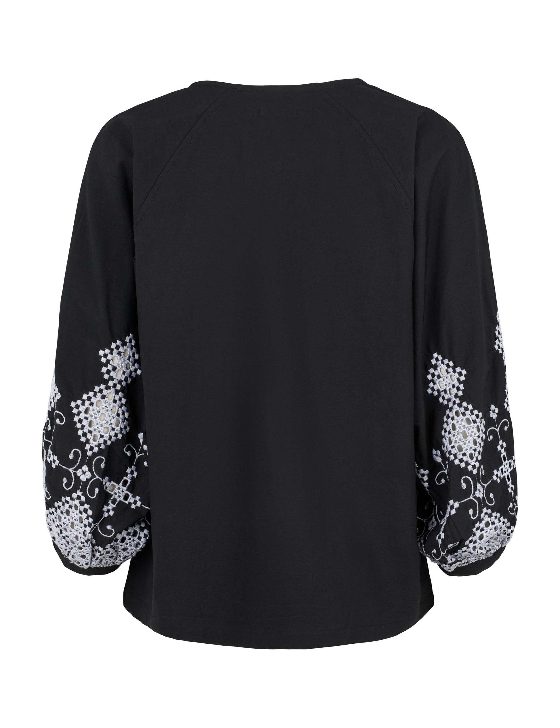 This blouse features relaxed balloon sleeves and delicate embroidery, blending effortless style with refined detail. The black fabric offers a versatile, timeless look, perfect for layering or wearing on its own. Its minimalist design ensures a modern, Scandinavian-inspired aesthetic ideal for both casual and elegant occasions.