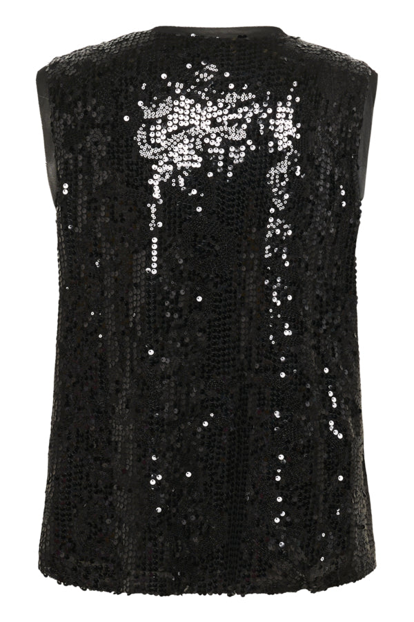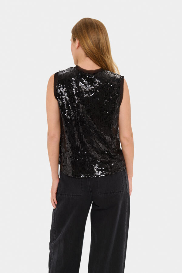 Effortless elegance meets understated glamour with this sleeveless sequin blouse. The minimalist silhouette allows the subtle shimmer of sequins to take centre stage, creating a piece that transitions seamlessly from day to evening. Perfect for layering or wearing solo, this black blouse embodies modern Scandinavian design—refined, versatile, and timelessly chic. An investment piece that elevates any wardrobe with quiet sophistication.