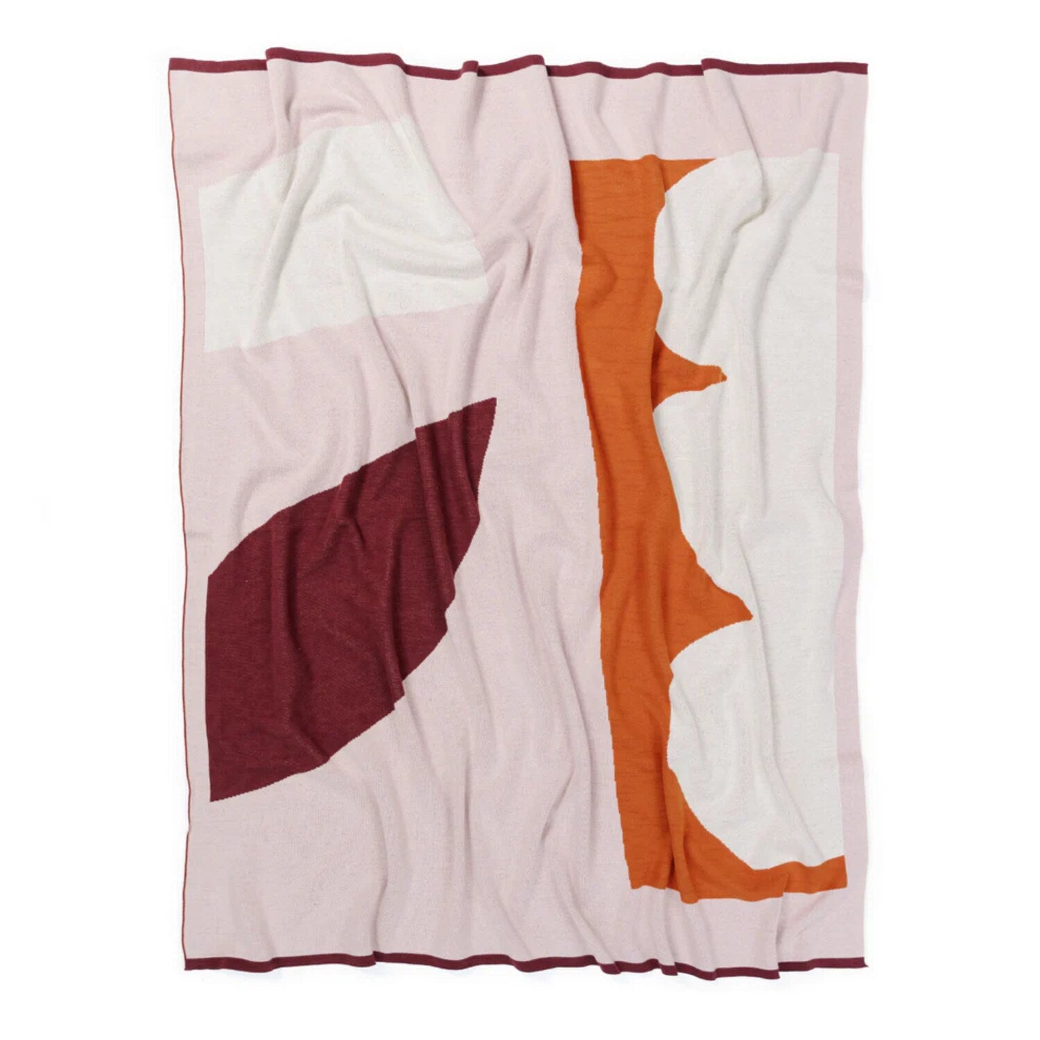 An impactful and colourful cotton knit throw from Sophie Home featuring this season's colours. Fall in love with bold burgundy and burnt orange shapes on a stunning pink base.