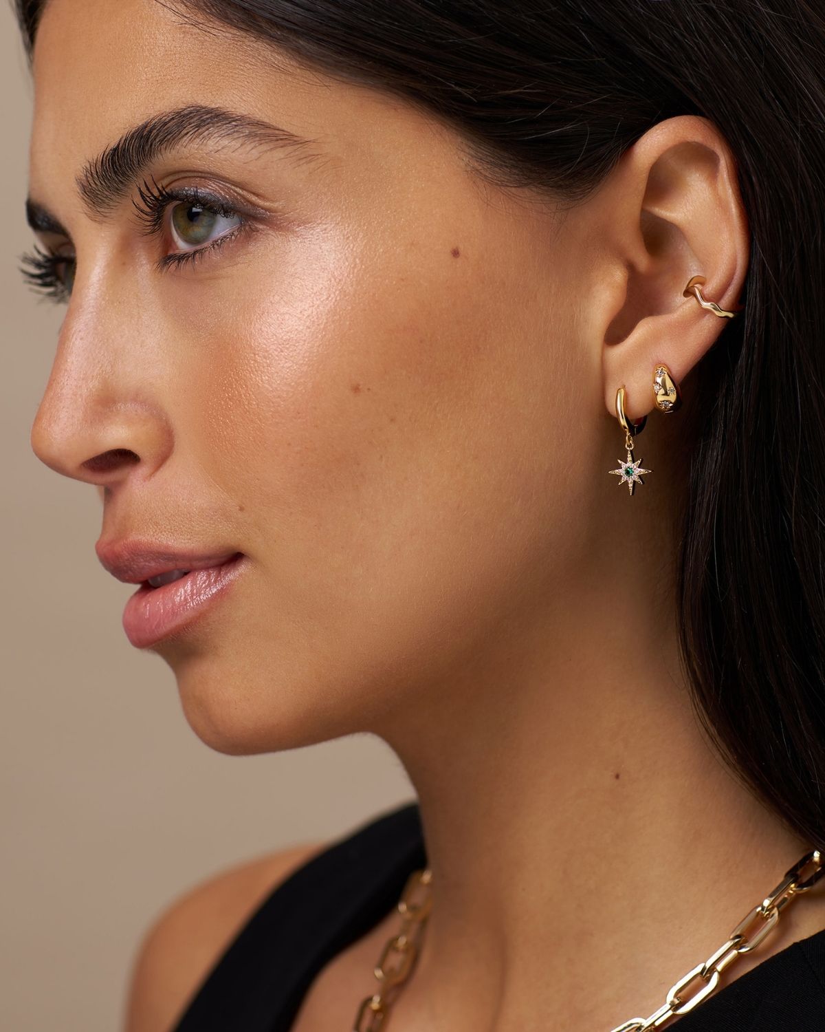 These Emerald Starburst Pavé Huggie Hoop Earrings will add a sparkle to any look.