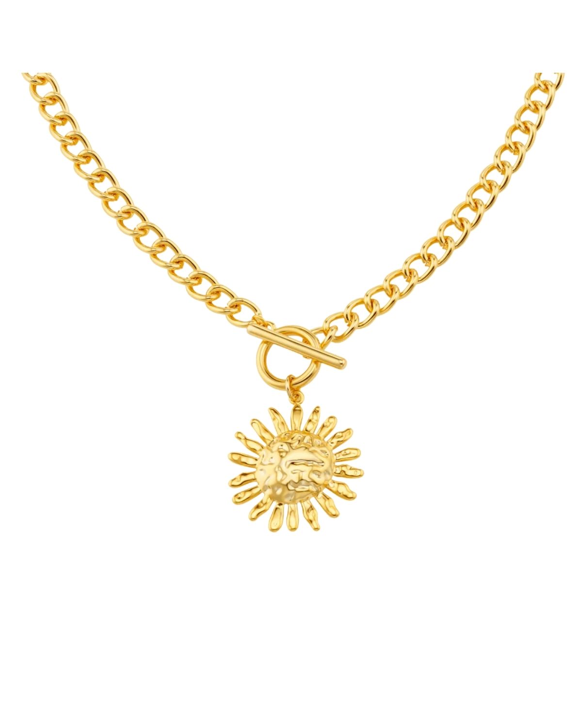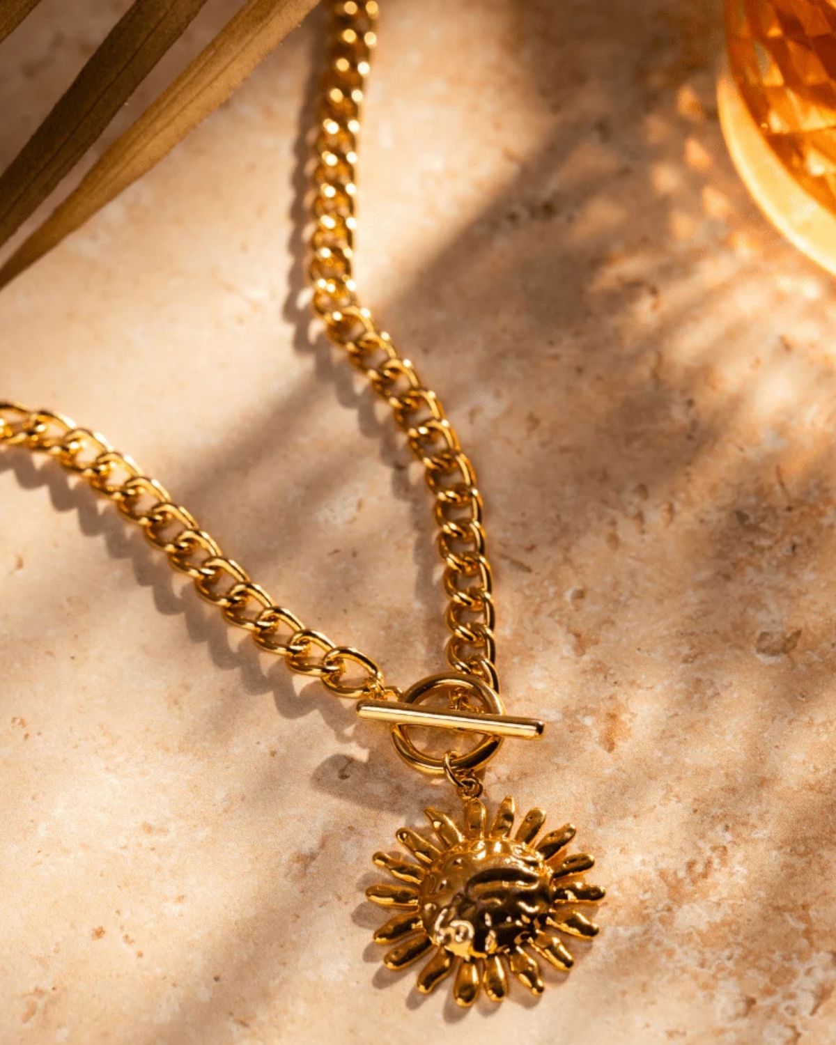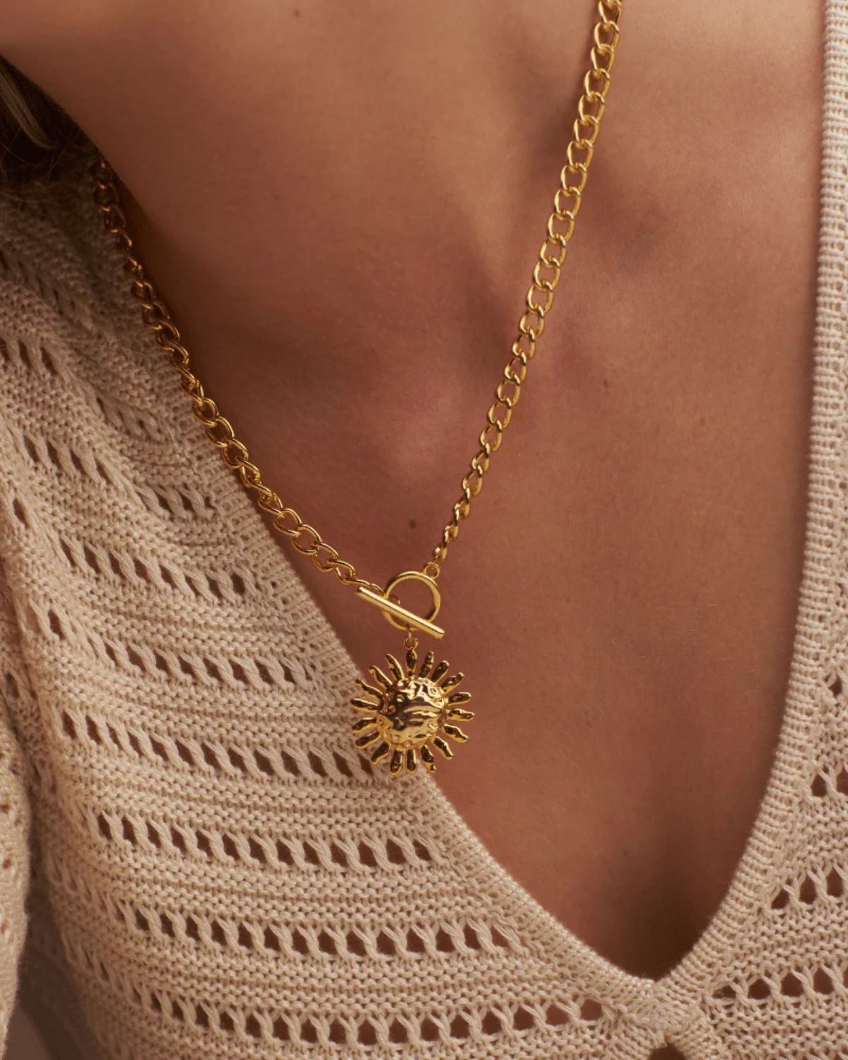 A radiant molten sun charm paired with the classic sleek t-bar chain, blending organic warmth with modern edge. Perfect for layering or worn solo.