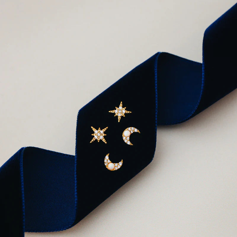 The Pavé & Opal Moon Stud Earrings. Featuring a luminous opal set against a crescent moon dusted with sparkling pavé crystals, these studs radiate cosmic charm in a delicate design. Small yet striking, they’re perfect for everyday wear.