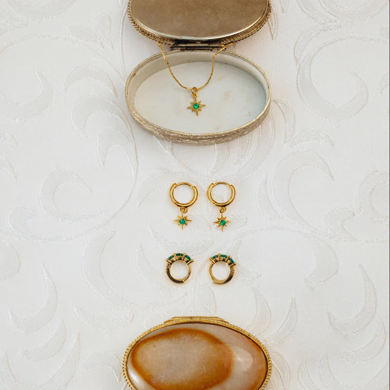 Add a pop of colour and celestial sparkle with our Emerald Starburst Micro Hoops. These petite gold hoop earrings feature a radiant starburst charm set with a vivid emerald-green at the centre. Sleek, lightweight and perfect for stacking.