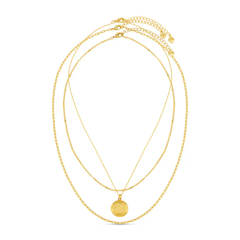 Effortless styling meets intricate detailing in the 3-Row Locket Necklace. Three separate necklaces that can be worn individually or layered together, each showcasing a unique chain style. The locket, etched with intricate detailing for a timeless vintage look, opens to reveal a hollow interior, designed for style rather than photos.