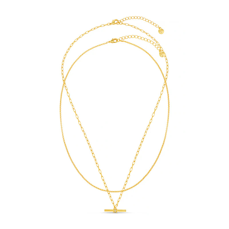 The Crystal T-bar 2-Row Necklace features a duo of jewellery staples on individual chains, pair them as intended or use them interchangeably. Both lightweight and comfortable for everyday wear, the T-bar chain is accented with a single delicate crystal.