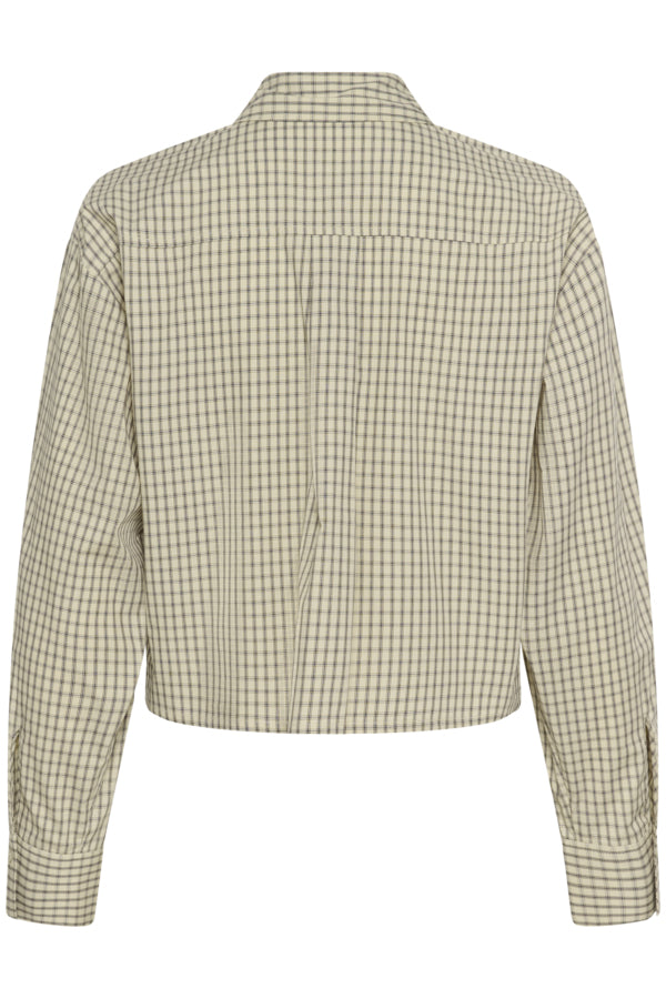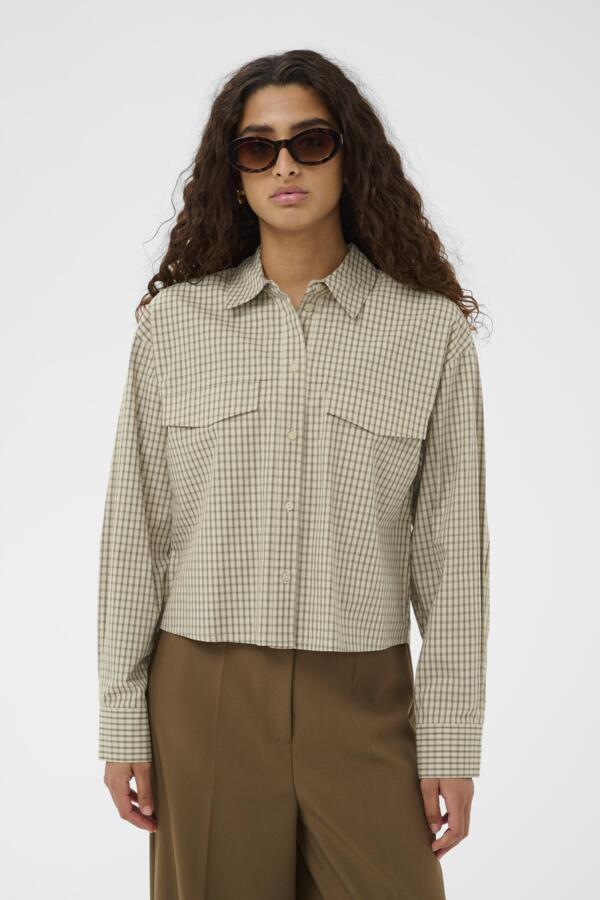 Checked shirt with a sharp collar, button front, and boxy cropped fit. Features two oversized chest flaps and long sleeves for a modern, structured look.