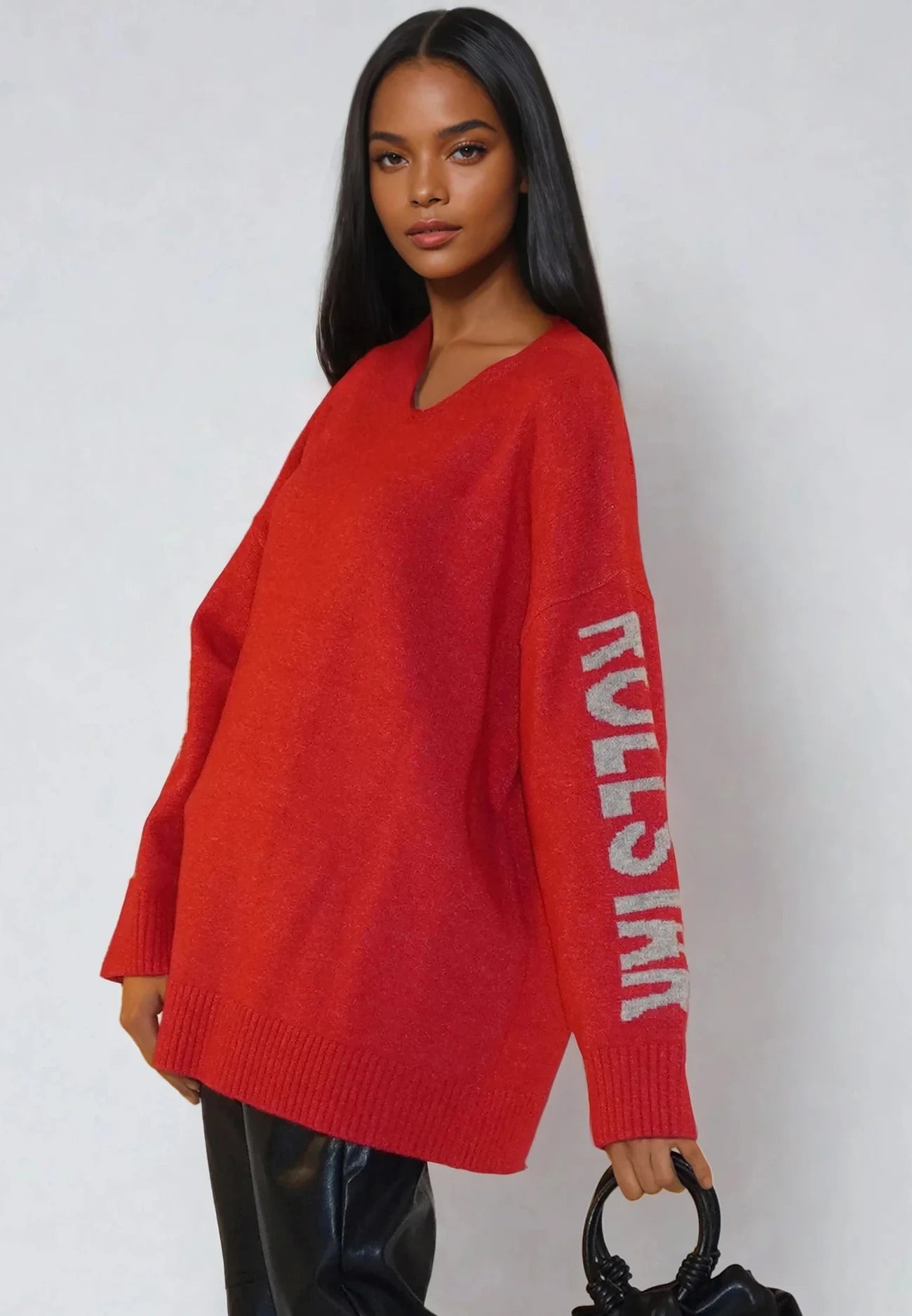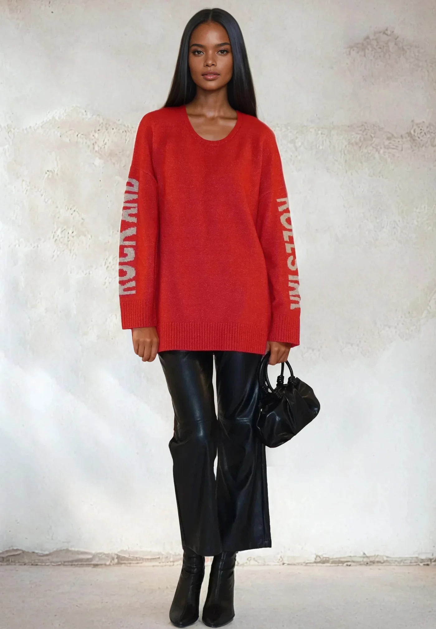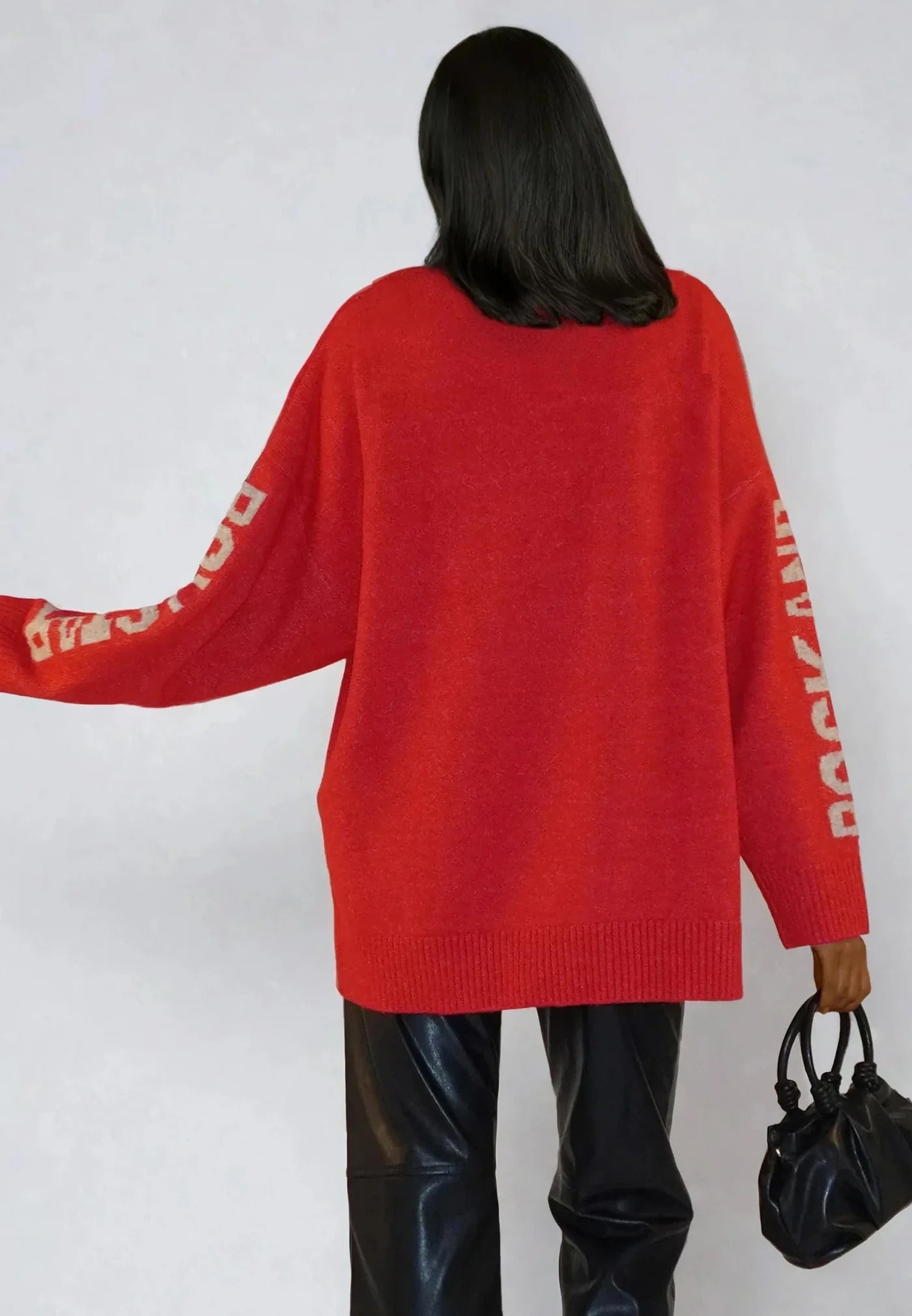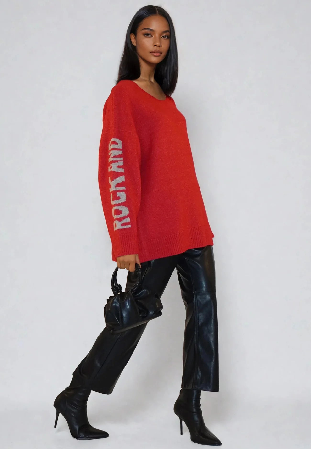 We reimagined our slogan knit this season with the Stardust jumper in red and soft pink. Crafted from a thick wool mix yarn, this regular fit jumper features a crew neck, long sleeves and is hip length. The rock n roll star slogan on the sleeves gives it an edge. Wear with your favourite jeans or trousers for an easy daytime look.
