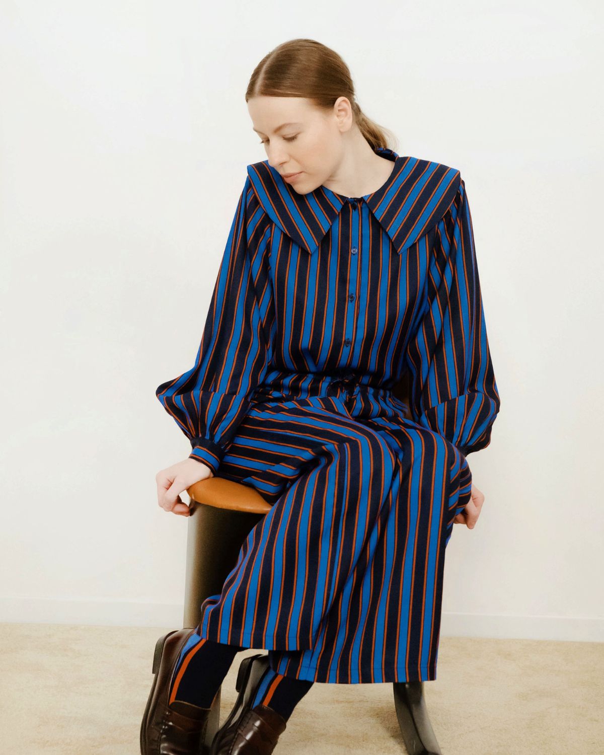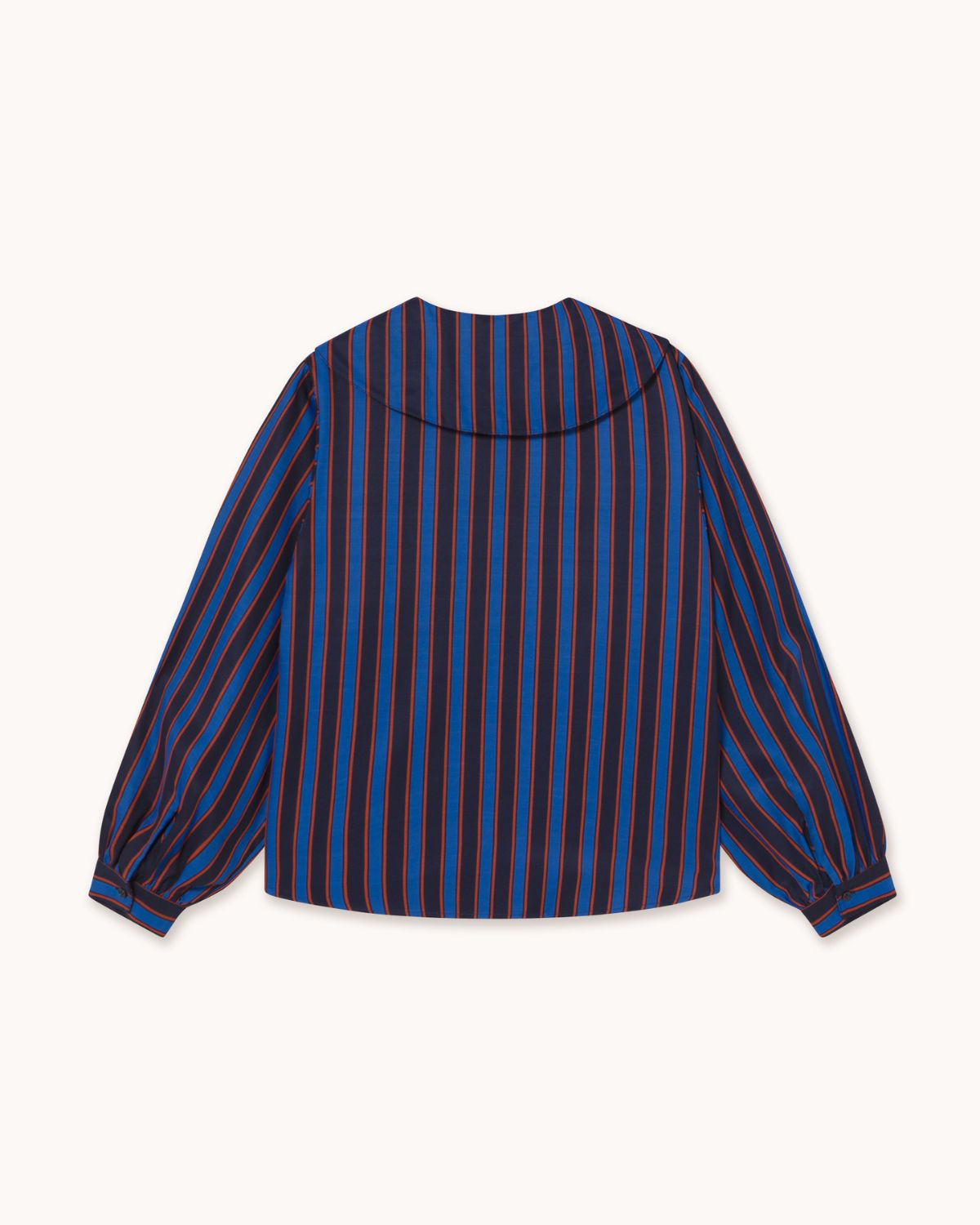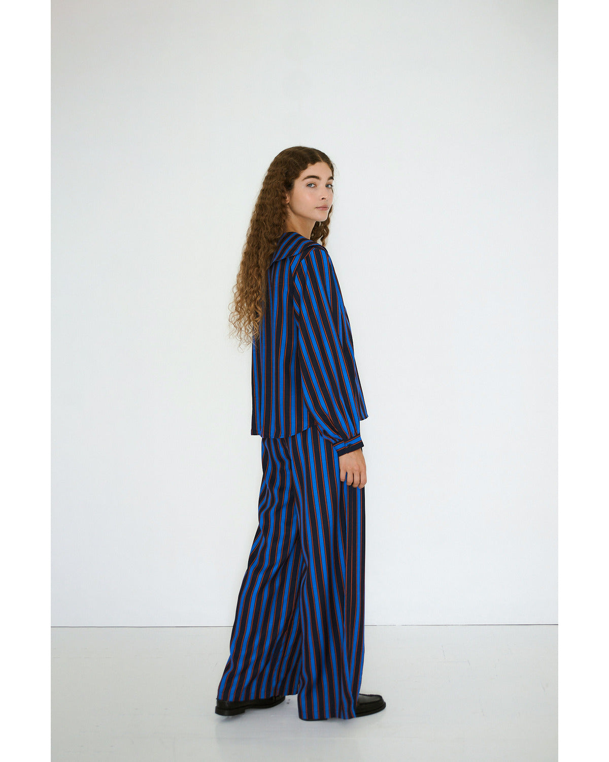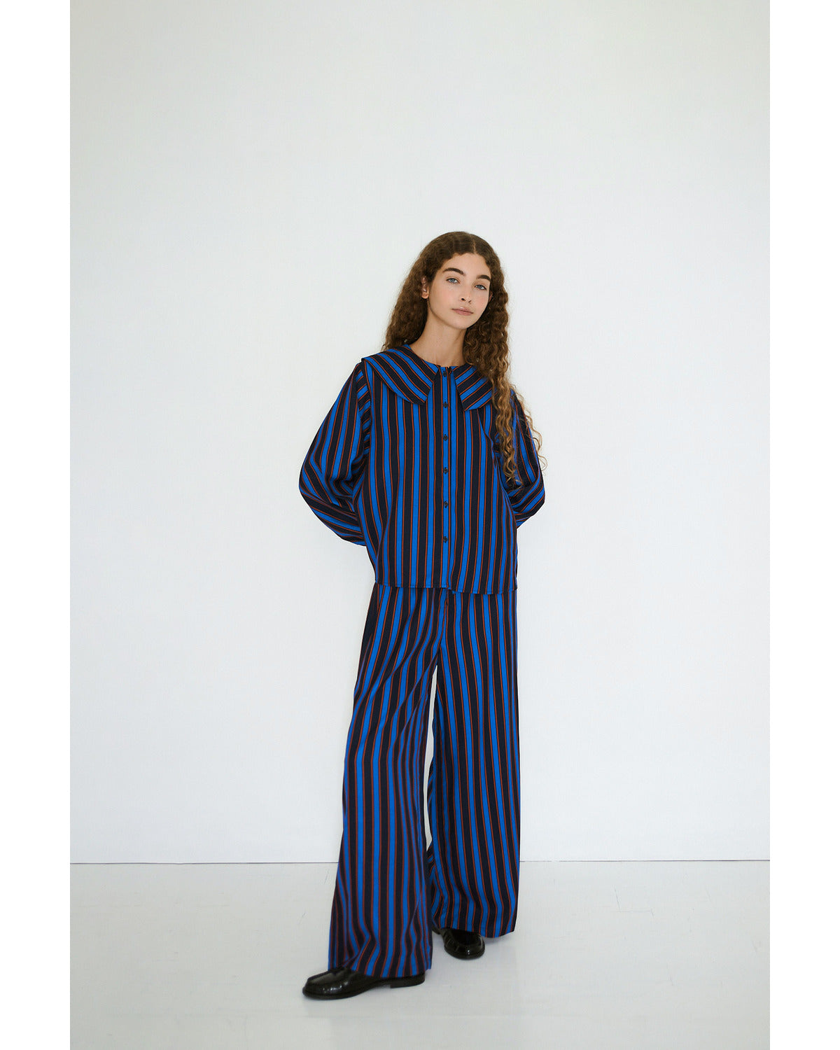 Crafted from a heavier-weight viscose blend, this blouse features a bold statement collar, front button fastening, and cuffed sleeves for a structured finish. Designed in a navy base with vibrant red and blue vertical stripes, it offers a refined silhouette. Pair with the matching trousers for a coordinated look.