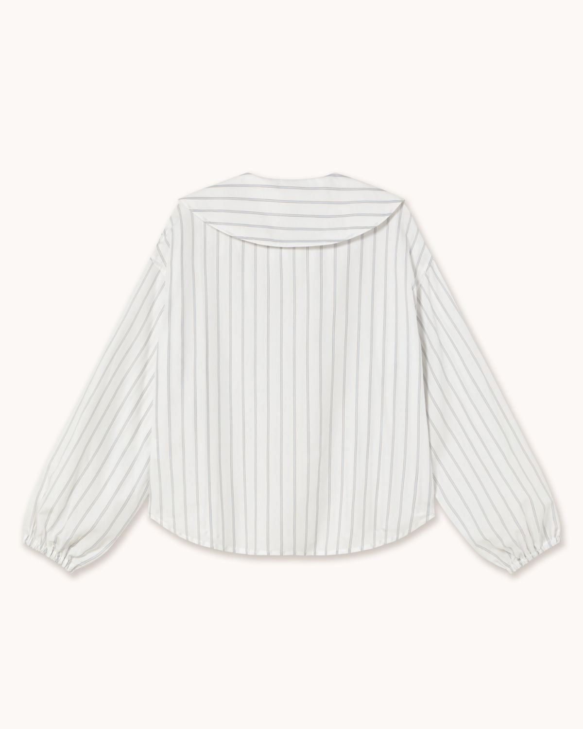 Crafted from yarn-dyed striped cotton poplin with an off-white base, this relaxed-fit blouse features a statement baby doll collar and dropped shoulders. Voluminous sleeves are finished with elasticated hems, creating a balanced silhouette. The double-breasted button opening adds a refined and modern touch.